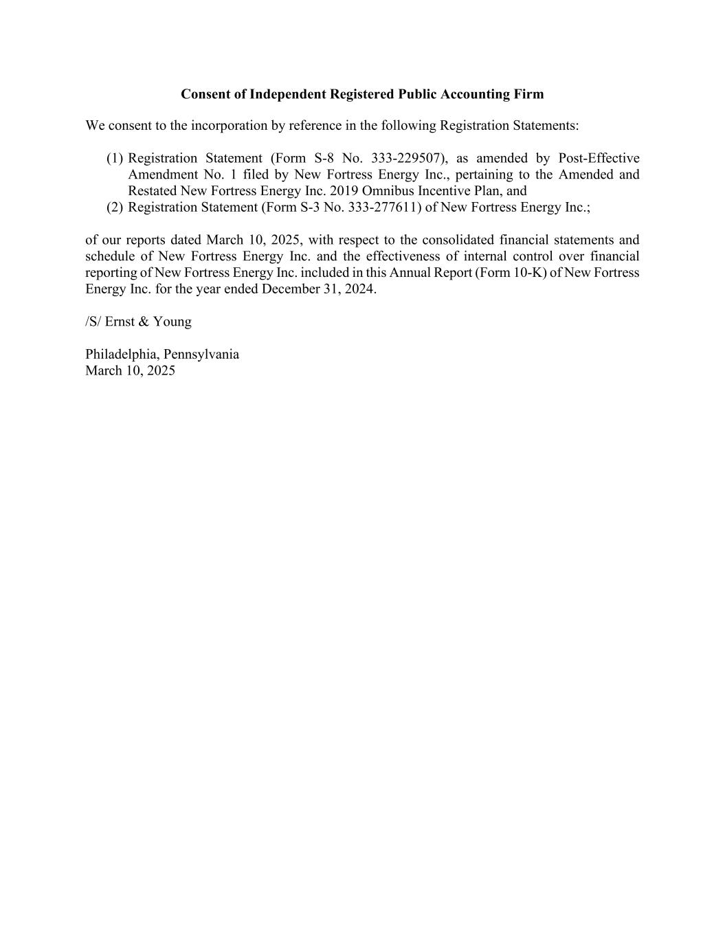 Consent of Independent Registered Public Accounting Firm We consent to the incorporation by reference in the following Registration Statements: (1) Registration Statement (Form S-8 No. 333-229507), as amended by Post-Effective Amendment No. 1 filed by New Fortress Energy Inc., pertaining to the Amended and Restated New Fortress Energy Inc. 2019 Omnibus Incentive Plan, and (2) Registration Statement (Form S-3 No. 333-277611) of New Fortress Energy Inc.; of our reports dated March 10, 2025, with respect to the consolidated financial statements and schedule of New Fortress Energy Inc. and the effectiveness of internal control over financial reporting of New Fortress Energy Inc. included in this Annual Report (Form 10-K) of New Fortress Energy Inc. for the year ended December 31, 2024. /S/ Ernst & Young Philadelphia, Pennsylvania March 10, 2025