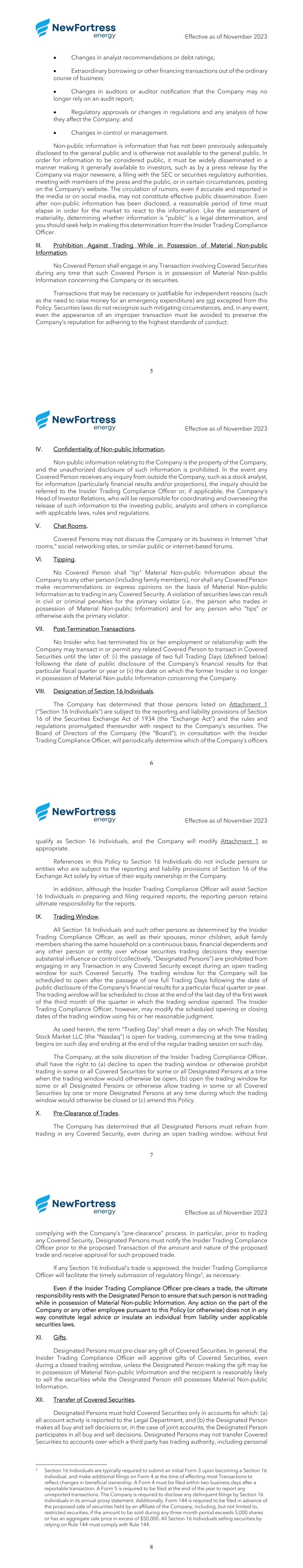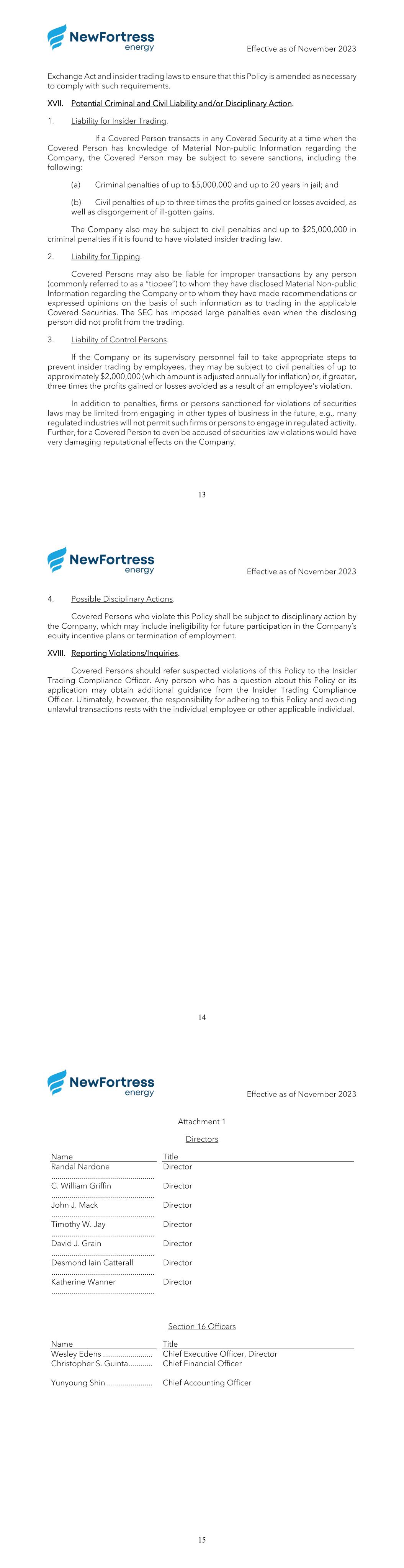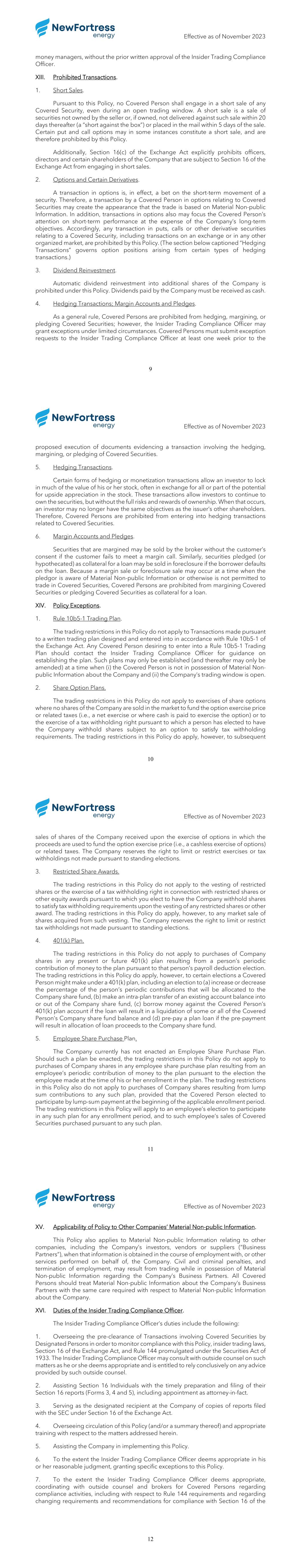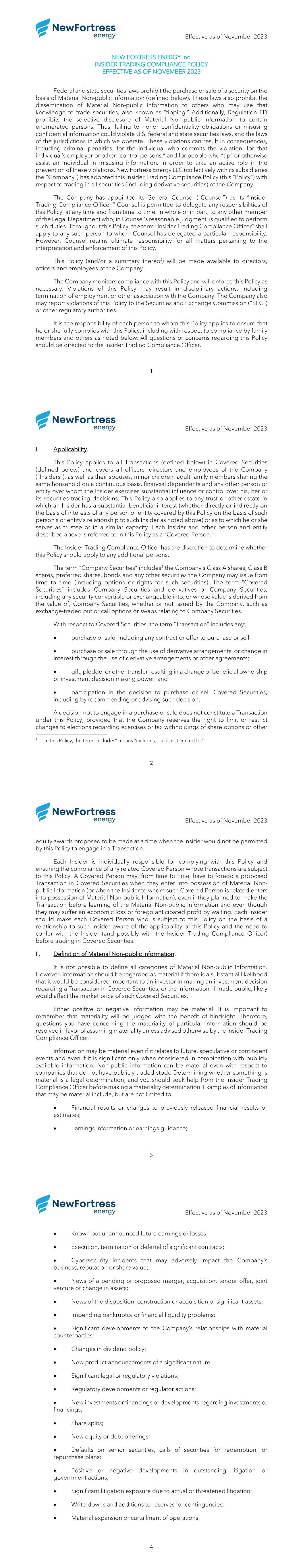 Effective as of November 2023 1 NEW FORTRESS ENERGY Inc. INSIDER TRADING COMPLIANCE POLICY EFFECTIVE AS OF NOVEMBER 2023 Federal and state securities laws prohibit the purchase or sale of a security on the basis of Material Non-public Information (defined below). These laws also prohibit the dissemination of Material Non-public Information to others who may use that knowledge to trade securities, also known as “tipping.” Additionally, Regulation FD prohibits the selective disclosure of Material Non-public Information to certain enumerated persons. Thus, failing to honor confidentiality obligations or misusing confidential information could violate U.S. federal and state securities laws, and the laws of the jurisdictions in which we operate. These violations can result in consequences, including criminal penalties, for the individual who commits the violation, for that individual’s employer or other “control persons,” and for people who “tip” or otherwise assist an individual in misusing information. In order to take an active role in the prevention of these violations, New Fortress Energy LLC (collectively with its subsidiaries, the “Company”) has adopted this Insider Trading Compliance Policy (this “Policy”) with respect to trading in all securities (including derivative securities) of the Company. The Company has appointed its General Counsel (“Counsel”) as its “Insider Trading Compliance Officer.” Counsel is permitted to delegate any responsibilities of this Policy, at any time and from time to time, in whole or in part, to any other member of the Legal Department who, in Counsel’s reasonable judgment, is qualified to perform such duties. Throughout this Policy, the term “Insider Trading Compliance Officer” shall apply to any such person to whom Counsel has delegated a particular responsibility. However, Counsel retains ultimate responsibility for all matters pertaining to the interpretation and enforcement of this Policy. This Policy (and/or a summary thereof) will be made available to directors, officers and employees of the Company. The Company monitors compliance with this Policy and will enforce this Policy as necessary. Violations of this Policy may result in disciplinary actions, including termination of employment or other association with the Company. The Company also may report violations of this Policy to the Securities and Exchange Commission (“SEC”) or other regulatory authorities. It is the responsibility of each person to whom this Policy applies to ensure that he or she fully complies with this Policy, including with respect to compliance by family members and others as noted below. All questions or concerns regarding this Policy should be directed to the Insider Trading Compliance Officer. Effective as of November 2023 2 I. Applicability. This Policy applies to all Transactions (defined below) in Covered Securities (defined below) and covers all officers, directors and employees of the Company (“Insiders”), as well as their spouses, minor children, adult family members sharing the same household on a continuous basis, financial dependents and any other person or entity over whom the Insider exercises substantial influence or control over his, her or its securities trading decisions. This Policy also applies to any trust or other estate in which an Insider has a substantial beneficial interest (whether directly or indirectly on the basis of interests of any person or entity covered by this Policy on the basis of such person’s or entity’s relationship to such Insider as noted above) or as to which he or she serves as trustee or in a similar capacity. Each Insider and other person and entity described above is referred to in this Policy as a “Covered Person.” The Insider Trading Compliance Officer has the discretion to determine whether this Policy should apply to any additional persons. The term “Company Securities” includes1 the Company’s Class A shares, Class B shares, preferred shares, bonds and any other securities the Company may issue from time to time (including options or rights for such securities). The term “Covered Securities” includes Company Securities and derivatives of Company Securities, including any security convertible or exchangeable into, or whose value is derived from the value of, Company Securities, whether or not issued by the Company, such as exchange-traded put or call options or swaps relating to Company Securities. With respect to Covered Securities, the term “Transaction” includes any: • purchase or sale, including any contract or offer to purchase or sell; • purchase or sale through the use of derivative arrangements, or change in interest through the use of derivative arrangements or other agreements; • gift, pledge, or other transfer resulting in a change of beneficial ownership or investment decision making power; and • participation in the decision to purchase or sell Covered Securities, including by recommending or advising such decision. A decision not to engage in a purchase or sale does not constitute a Transaction under this Policy, provided that the Company reserves the right to limit or restrict changes to elections regarding exercises or tax withholdings of share options or other 1 In this Policy, the term “includes” means “includes, but is not limited to.” Effective as of November 2023 3 equity awards proposed to be made at a time when the Insider would not be permitted by this Policy to engage in a Transaction. Each Insider is individually responsible for complying with this Policy and ensuring the compliance of any related Covered Person whose transactions are subject to this Policy. A Covered Person may, from time to time, have to forego a proposed Transaction in Covered Securities when they enter into possession of Material Non- public Information (or when the Insider to whom such Covered Person is related enters into possession of Material N