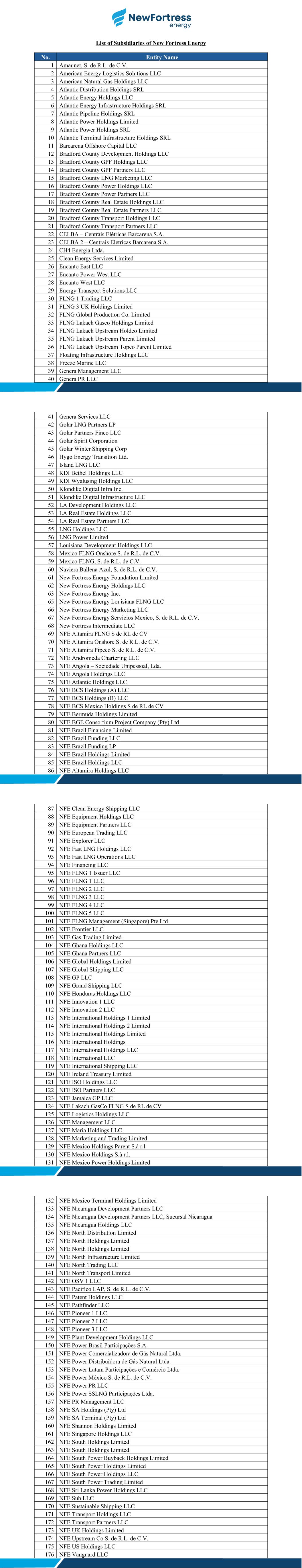 List of Subsidiaries of New Fortress Energy No. Entity Name 1 Amaunet, S. de R.L. de C.V. 2 American Energy Logistics Solutions LLC 3 American Natural Gas Holdings LLC 4 Atlantic Distribution Holdings SRL 5 Atlantic Energy Holdings LLC 6 Atlantic Energy Infrastructure Holdings SRL 7 Atlantic Pipeline Holdings SRL 8 Atlantic Power Holdings Limited 9 Atlantic Power Holdings SRL 10 Atlantic Terminal Infrastructure Holdings SRL 11 Barcarena Offshore Capital LLC 12 Bradford County Development Holdings LLC 13 Bradford County GPF Holdings LLC 14 Bradford County GPF Partners LLC 15 Bradford County LNG Marketing LLC 16 Bradford County Power Holdings LLC 17 Bradford County Power Partners LLC 18 Bradford County Real Estate Holdings LLC 19 Bradford County Real Estate Partners LLC 20 Bradford County Transport Holdings LLC 21 Bradford County Transport Partners LLC 22 CELBA – Centrais Elétricas Barcarena S.A. 23 CELBA 2 – Centrais Eletricas Barcarena S.A. 24 CH4 Energia Ltda. 25 Clean Energy Services Limited 26 Encanto East LLC 27 Encanto Power West LLC 28 Encanto West LLC 29 Energy Transport Solutions LLC 30 FLNG 1 Trading LLC 31 FLNG 3 UK Holdings Limited 32 FLNG Global Production Co. Limited 33 FLNG Lakach Gasco Holdings Limited 34 FLNG Lakach Upstream Holdco Limited 35 FLNG Lakach Upstream Parent Limited 36 FLNG Lakach Upstream Topco Parent Limited 37 Floating Infrastructure Holdings LLC 38 Freeze Marine LLC 39 Genera Management LLC 40 Genera PR LLC 41 Genera Services LLC 42 Golar LNG Partners LP 43 Golar Partners Finco LLC 44 Golar Spirit Corporation 45 Golar Winter Shipping Corp 46 Hygo Energy Transition Ltd. 47 Island LNG LLC 48 KDI Bethel Holdings LLC 49 KDI Wyalusing Holdings LLC 50 Klondike Digital Infra Inc. 51 Klondike Digital Infrastructure LLC 52 LA Development Holdings LLC 53 LA Real Estate Holdings LLC 54 LA Real Estate Partners LLC 55 LNG Holdings LLC 56 LNG Power Limited 57 Louisiana Development Holdings LLC 58 Mexico FLNG Onshore S. de R.L. de C.V. 59 Mexico FLNG, S. de R.L. de C.V. 60 Naviera Ballena Azul, S. de R.L. de C.V. 61 New Fortress Energy Foundation Limited 62 New Fortress Energy Holdings LLC 63 New Fortress Energy Inc. 65 New Fortress Energy Louisiana FLNG LLC 66 New Fortress Energy Marketing LLC 67 New Fortress Energy Servicios Mexico, S. de R.L. de C.V. 68 New Fortress Intermediate LLC 69 NFE Altamira FLNG S de RL de CV 70 NFE Altamira Onshore S. de R.L. de C.V. 71 NFE Altamira Pipeco S. de R.L. de C.V. 72 NFE Andromeda Chartering LLC 73 NFE Angola – Sociedade Unipessoal, Lda. 74 NFE Angola Holdings LLC 75 NFE Atlantic Holdings LLC 76 NFE BCS Holdings (A) LLC 77 NFE BCS Holdings (B) LLC 78 NFE BCS Mexico Holdings S de RL de CV 79 NFE Bermuda Holdings Limited 80 NFE BGE Consortium Project Company (Pty) Ltd 81 NFE Brazil Financing Limited 82 NFE Brazil Funding LLC 83 NFE Brazil Funding LP 84 NFE Brazil Holdings Limited 85 NFE Brazil Holdings LLC 86 NFE Altamira Holdings LLC 87 NFE Clean Energy Shipping LLC 88 NFE Equipment Holdings LLC 89 NFE Equipment Partners LLC 90 NFE European Trading LLC 91 NFE Explorer LLC 92 NFE Fast LNG Holdings LLC 93 NFE Fast LNG Operations LLC 94 NFE Financing LLC 95 NFE FLNG 1 Issuer LLC 96 NFE FLNG 1 LLC 97 NFE FLNG 2 LLC 98 NFE FLNG 3 LLC 99 NFE FLNG 4 LLC 100 NFE FLNG 5 LLC 101 NFE FLNG Management (Singapore) Pte Ltd 102 NFE Frontier LLC 103 NFE Gas Trading Limited 104 NFE Ghana Holdings LLC 105 NFE Ghana Partners LLC 106 NFE Global Holdings Limited 107 NFE Global Shipping LLC 108 NFE GP LLC 109 NFE Grand Shipping LLC 110 NFE Honduras Holdings LLC 111 NFE Innovation 1 LLC 112 NFE Innovation 2 LLC 113 NFE International Holdings 1 Limited 114 NFE International Holdings 2 Limited 115 NFE International Holdings Limited 116 NFE International Holdings 117 NFE International Holdings LLC 118 NFE International LLC 119 NFE International Shipping LLC 120 NFE Ireland Treasury Limited 121 NFE ISO Holdings LLC 122 NFE ISO Partners LLC 123 NFE Jamaica GP LLC 124 NFE Lakach GasCo FLNG S de RL de CV 125 NFE Logistics Holdings LLC 126 NFE Management LLC 127 NFE Maria Holdings LLC 128 NFE Marketing and Trading Limited 129 NFE Mexico Holdings Parent S.à r.l. 130 NFE Mexico Holdings S.à r.l. 131 NFE Mexico Power Holdings Limited 132 NFE Mexico Terminal Holdings Limited 133 NFE Nicaragua Development Partners LLC 134 NFE Nicaragua Development Partners LLC, Sucursal Nicaragua 135 NFE Nicaragua Holdings LLC 136 NFE North Distribution Limited 137 NFE North Holdings Limited 138 NFE North Holdings Limited 139 NFE North Infrastructure Limited 140 NFE North Trading LLC 141 NFE North Transport Limited 142 NFE OSV 1 LLC 143 NFE Pacifico LAP, S. de R.L. de C.V. 144 NFE Patent Holdings LLC 145 NFE Pathfinder LLC 146 NFE Pioneer 1 LLC 147 NFE Pioneer 2 LLC 148 NFE Pioneer 3 LLC 149 NFE Plant Development Holdings LLC 150 NFE Power Brasil Participações S.A. 151 NFE Power Comercializadora de Gás Natural Ltda. 152 NFE Power Distribuidora de Gás Natural Ltda. 153 NFE Power Latam Participações e Comércio Ltda. 154 NFE Power México S. de R.L. de C.V. 155 NFE Power PR LLC 156 NFE Power SSLNG Participações Ltda. 157 NFE PR Management LLC 158 NFE SA Holdings (Pty) Ltd 159 NFE SA Terminal (Pty) Ltd 160 NFE Shannon Holdings Limited 161 NFE Singapore Holdings LLC 162 NFE South Holdings Limited 163 NFE South Holdings Limited 164 NFE South Power Buyback Holdings Limited 165 NFE South Power Holdings Limited 166 NFE South Power Holdings LLC 167 NFE South Power Trading Limited 168 NFE Sri Lanka Power Holdings LLC 169 NFE Sub LLC 170 NFE Sustainable Shipping LLC 171 NFE Transport Holdings LLC 172 NFE Transport Partners LLC 173 NFE UK Holdings Limited 174 NFE Upstream Co S. de R.L. de C.V. 175 NFE US Holdings LLC 176 NFE Vanguard LLC