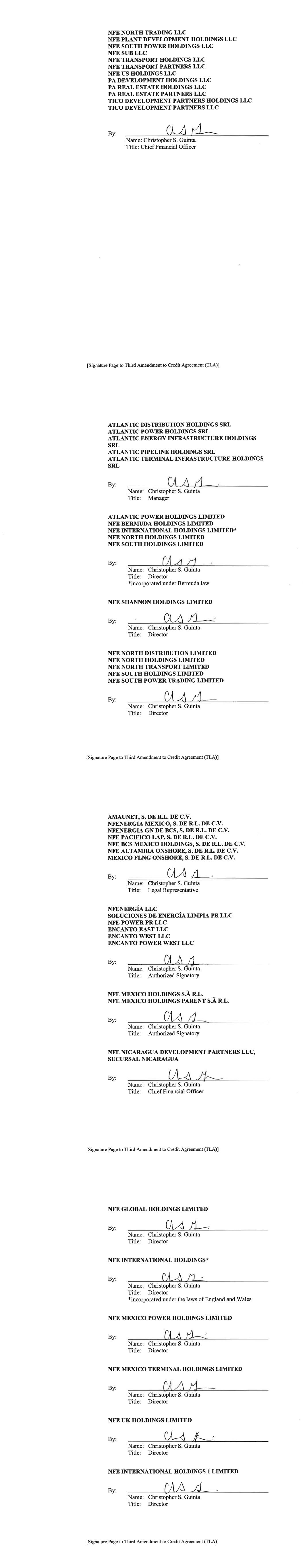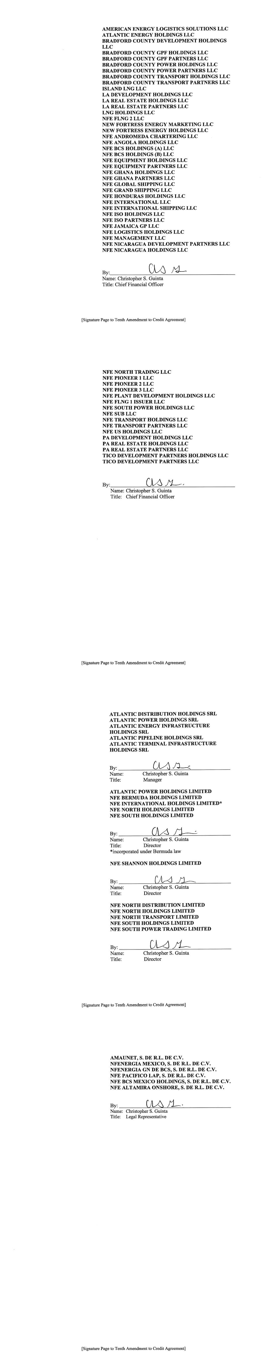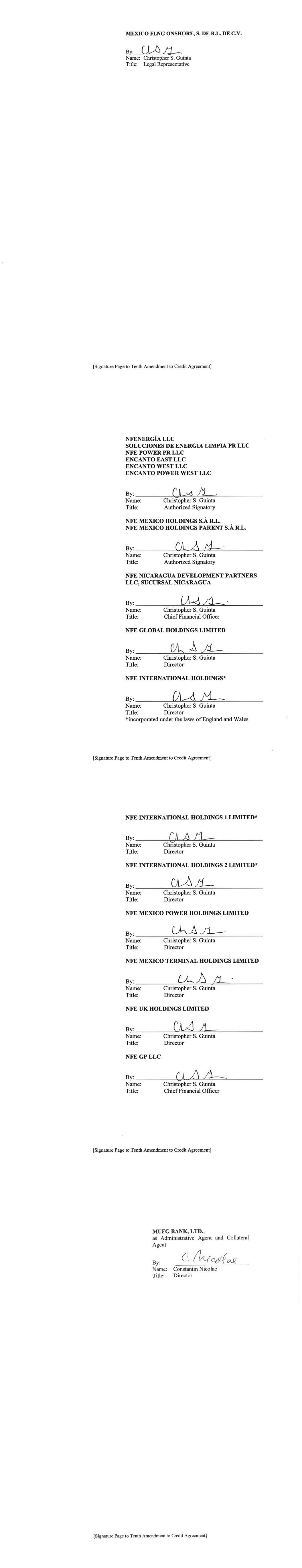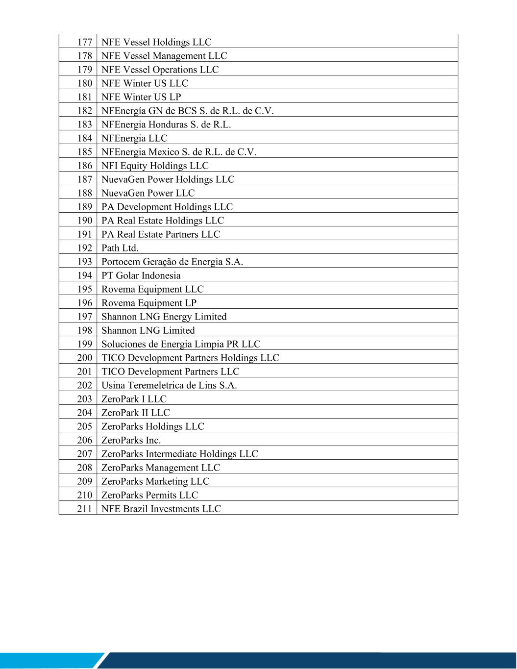 177 NFE Vessel Holdings LLC 178 NFE Vessel Management LLC 179 NFE Vessel Operations LLC 180 NFE Winter US LLC 181 NFE Winter US LP 182 NFEnergía GN de BCS S. de R.L. de C.V. 183 NFEnergia Honduras S. de R.L. 184 NFEnergia LLC 185 NFEnergia Mexico S. de R.L. de C.V. 186 NFI Equity Holdings LLC 187 NuevaGen Power Holdings LLC 188 NuevaGen Power LLC 189 PA Development Holdings LLC 190 PA Real Estate Holdings LLC 191 PA Real Estate Partners LLC 192 Path Ltd. 193 Portocem Geração de Energia S.A. 194 PT Golar Indonesia 195 Rovema Equipment LLC 196 Rovema Equipment LP 197 Shannon LNG Energy Limited 198 Shannon LNG Limited 199 Soluciones de Energia Limpia PR LLC 200 TICO Development Partners Holdings LLC 201 TICO Development Partners LLC 202 Usina Teremeletrica de Lins S.A. 203 ZeroPark I LLC 204 ZeroPark II LLC 205 ZeroParks Holdings LLC 206 ZeroParks Inc. 207 ZeroParks Intermediate Holdings LLC 208 ZeroParks Management LLC 209 ZeroParks Marketing LLC 210 ZeroParks Permits LLC 211 NFE Brazil Investments LLC