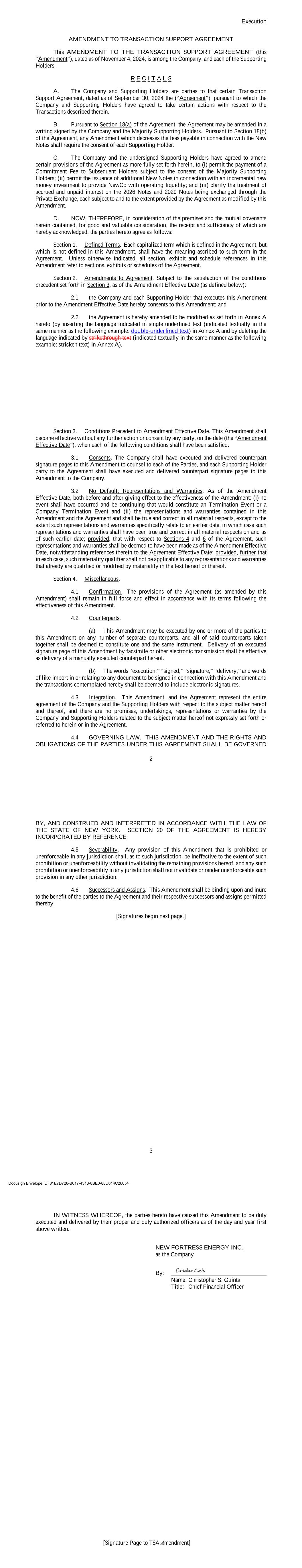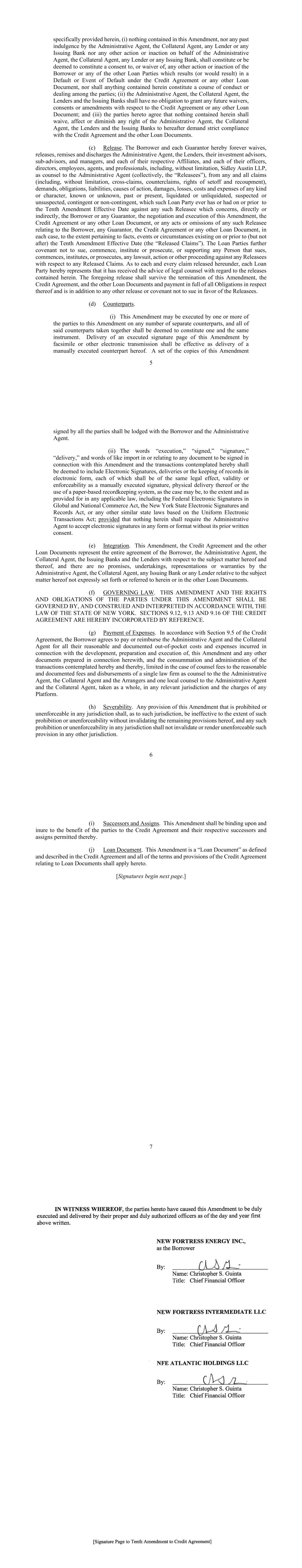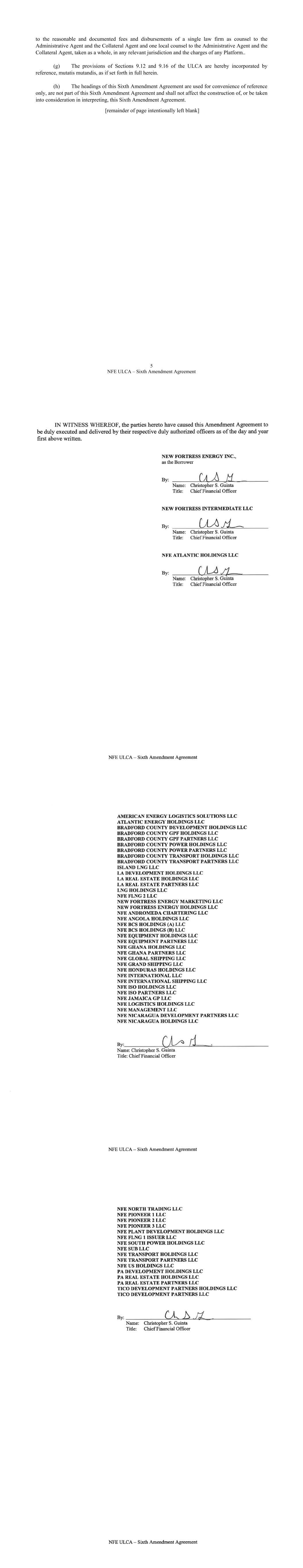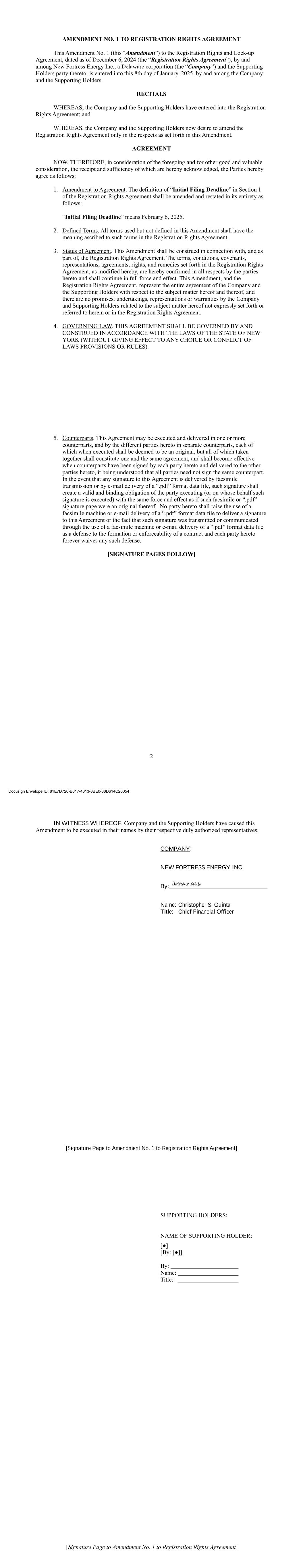AMENDMENT NO. 1 TO REGISTRATION RIGHTS AGREEMENT This Amendment No. 1 (this “Amendment”) to the Registration Rights and Lock-up Agreement, dated as of December 6, 2024 (the “Registration Rights Agreement”), by and among New Fortress Energy Inc., a Delaware corporation (the “Company”) and the Supporting Holders party thereto, is entered into this 8th day of January, 2025, by and among the Company and the Supporting Holders. RECITALS WHEREAS, the Company and the Supporting Holders have entered into the Registration Rights Agreement; and WHEREAS, the Company and the Supporting Holders now desire to amend the Registration Rights Agreement only in the respects as set forth in this Amendment. AGREEMENT NOW, THEREFORE, in consideration of the foregoing and for other good and valuable consideration, the receipt and sufficiency of which are hereby acknowledged, the Parties hereby agree as follows: 1. Amendment to Agreement. The definition of “Initial Filing Deadline” in Section 1 of the Registration Rights Agreement shall be amended and restated in its entirety as follows: “Initial Filing Deadline” means February 6, 2025. 2. Defined Terms. All terms used but not defined in this Amendment shall have the meaning ascribed to such terms in the Registration Rights Agreement. 3. Status of Agreement. This Amendment shall be construed in connection with, and as part of, the Registration Rights Agreement. The terms, conditions, covenants, representations, agreements, rights, and remedies set forth in the Registration Rights Agreement, as modified hereby, are hereby confirmed in all respects by the parties hereto and shall continue in full force and effect. This Amendment, and the Registration Rights Agreement, represent the entire agreement of the Company and the Supporting Holders with respect to the subject matter hereof and thereof, and there are no promises, undertakings, representations or warranties by the Company and Supporting Holders related to the subject matter hereof not expressly set forth or referred to herein or in the Registration Rights Agreement. 4. GOVERNING LAW. THIS AGREEMENT SHALL BE GOVERNED BY AND CONSTRUED IN ACCORDANCE WITH THE LAWS OF THE STATE OF NEW YORK (WITHOUT GIVING EFFECT TO ANY CHOICE OR CONFLICT OF LAWS PROVISIONS OR RULES). 2 5. Counterparts. This Agreement may be executed and delivered in one or more counterparts, and by the different parties hereto in separate counterparts, each of which when executed shall be deemed to be an original, but all of which taken together shall constitute one and the same agreement, and shall become effective when counterparts have been signed by each party hereto and delivered to the other parties hereto, it being understood that all parties need not sign the same counterpart. In the event that any signature to this Agreement is delivered by facsimile transmission or by e-mail delivery of a “.pdf” format data file, such signature shall create a valid and binding obligation of the party executing (or on whose behalf such signature is executed) with the same force and effect as if such facsimile or “.pdf” signature page were an original thereof. No party hereto shall raise the use of a facsimile machine or e-mail delivery of a “.pdf” format data file to deliver a signature to this Agreement or the fact that such signature was transmitted or communicated through the use of a facsimile machine or e-mail delivery of a “.pdf” format data file as a defense to the formation or enforceability of a contract and each party hereto forever waives any such defense. [SIGNATURE PAGES FOLLOW] [Signature Page to Amendment No. 1 to Registration Rights Agreement] IN WITNESS WHEREOF, Company and the Supporting Holders have caused this Amendment to be executed in their names by their respective duly authorized representatives. COMPANY: NEW FORTRESS ENERGY INC. By: Name: Christopher S. Guinta Title: Chief Financial Officer Docusign Envelope ID: 81E7D726-B017-4313-8BE0-88D614C26054 [Signature Page to Amendment No. 1 to Registration Rights Agreement] SUPPORTING HOLDERS: NAME OF SUPPORTING HOLDER: [●] [By: [●]] By: Name: Title: