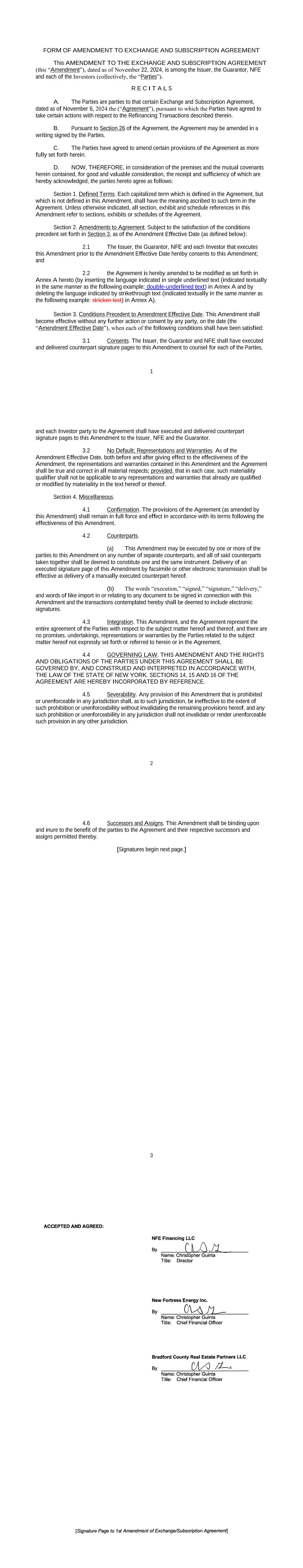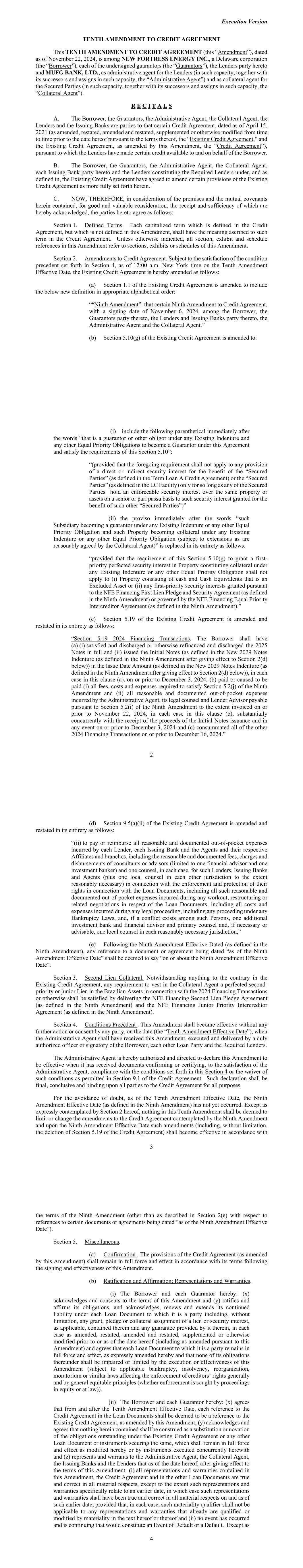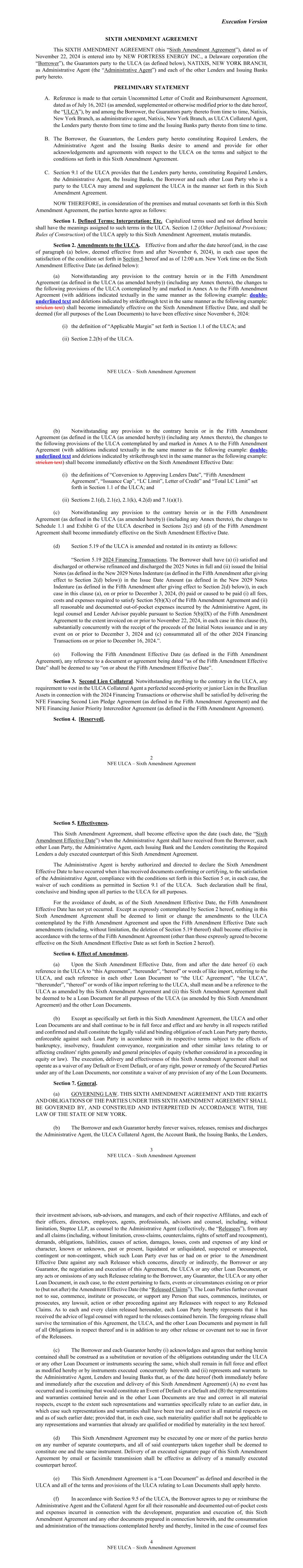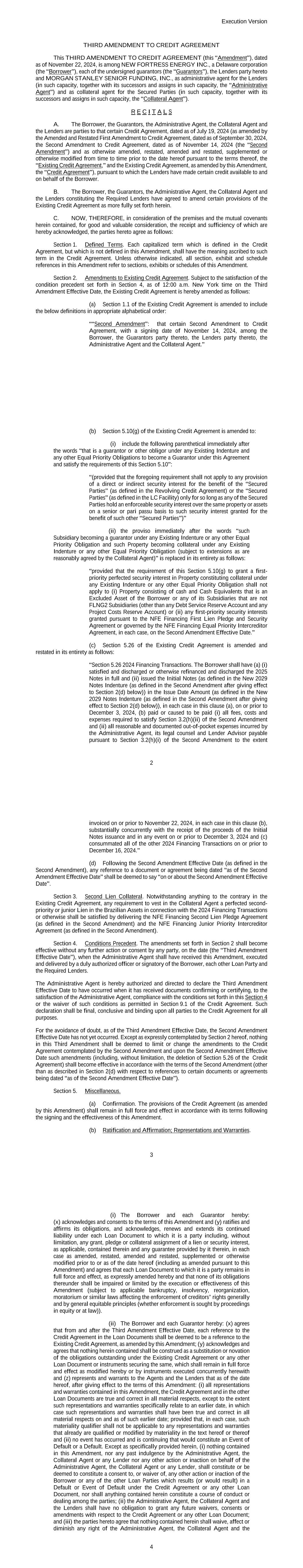 AMENDMENT NO. 1 TO REGISTRATION RIGHTS AGREEMENT This Amendment No. 1 (this “Amendment”) to the Registration Rights and Lock-up Agreement, dated as of December 6, 2024 (the “Registration Rights Agreement”), by and among New Fortress Energy Inc., a Delaware corporation (the “Company”) and the Supporting Holders party thereto, is entered into this 8th day of January, 2025, by and among the Company and the Supporting Holders. RECITALS WHEREAS, the Company and the Supporting Holders have entered into the Registration Rights Agreement; and WHEREAS, the Company and the Supporting Holders now desire to amend the Registration Rights Agreement only in the respects as set forth in this Amendment. AGREEMENT NOW, THEREFORE, in consideration of the foregoing and for other good and valuable consideration, the receipt and sufficiency of which are hereby acknowledged, the Parties hereby agree as follows: 1. Amendment to Agreement. The definition of “Initial Filing Deadline” in Section 1 of the Registration Rights Agreement shall be amended and restated in its entirety as follows: “Initial Filing Deadline” means February 6, 2025. 2. Defined Terms. All terms used but not defined in this Amendment shall have the meaning ascribed to such terms in the Registration Rights Agreement. 3. Status of Agreement. This Amendment shall be construed in connection with, and as part of, the Registration Rights Agreement. The terms, conditions, covenants, representations, agreements, rights, and remedies set forth in the Registration Rights Agreement, as modified hereby, are hereby confirmed in all respects by the parties hereto and shall continue in full force and effect. This Amendment, and the Registration Rights Agreement, represent the entire agreement of the Company and the Supporting Holders with respect to the subject matter hereof and thereof, and there are no promises, undertakings, representations or warranties by the Company and Supporting Holders related to the subject matter hereof not expressly set forth or referred to herein or in the Registration Rights Agreement. 4. GOVERNING LAW. THIS AGREEMENT SHALL BE GOVERNED BY AND CONSTRUED IN ACCORDANCE WITH THE LAWS OF THE STATE OF NEW YORK (WITHOUT GIVING EFFECT TO ANY CHOICE OR CONFLICT OF LAWS PROVISIONS OR RULES). 2 5. Counterparts. This Agreement may be executed and delivered in one or more counterparts, and by the different parties hereto in separate counterparts, each of which when executed shall be deemed to be an original, but all of which taken together shall constitute one and the same agreement, and shall become effective when counterparts have been signed by each party hereto and delivered to the other parties hereto, it being understood that all parties need not sign the same counterpart. In the event that any signature to this Agreement is delivered by facsimile transmission or by e-mail delivery of a “.pdf” format data file, such signature shall create a valid and binding obligation of the party executing (or on whose behalf such signature is executed) with the same force and effect as if such facsimile or “.pdf” signature page were an original thereof. No party hereto shall raise the use of a facsimile machine or e-mail delivery of a “.pdf” format data file to deliver a signature to this Agreement or the fact that such signature was transmitted or communicated through the use of a facsimile machine or e-mail delivery of a “.pdf” format data file as a defense to the formation or enforceability of a contract and each party hereto forever waives any such defense. [SIGNATURE PAGES FOLLOW] [Signature Page to Amendment No. 1 to Registration Rights Agreement] IN WITNESS WHEREOF, Company and the Supporting Holders have caused this Amendment to be executed in their names by their respective duly authorized representatives. COMPANY: NEW FORTRESS ENERGY INC. By: Name: Christopher S. Guinta Title: Chief Financial Officer Docusign Envelope ID: 81E7D726-B017-4313-8BE0-88D614C26054 [Signature Page to Amendment No. 1 to Registration Rights Agreement] SUPPORTING HOLDERS: NAME OF SUPPORTING HOLDER: [●] [By: [●]] By: Name: Title: