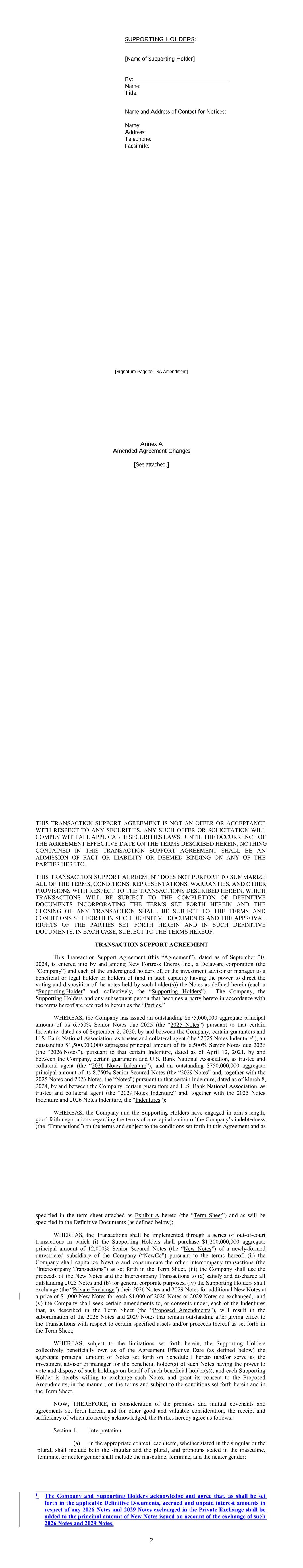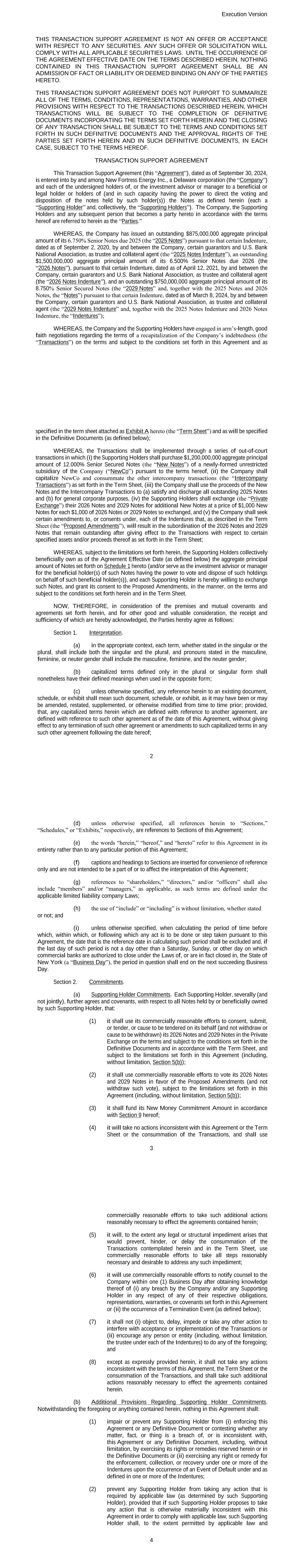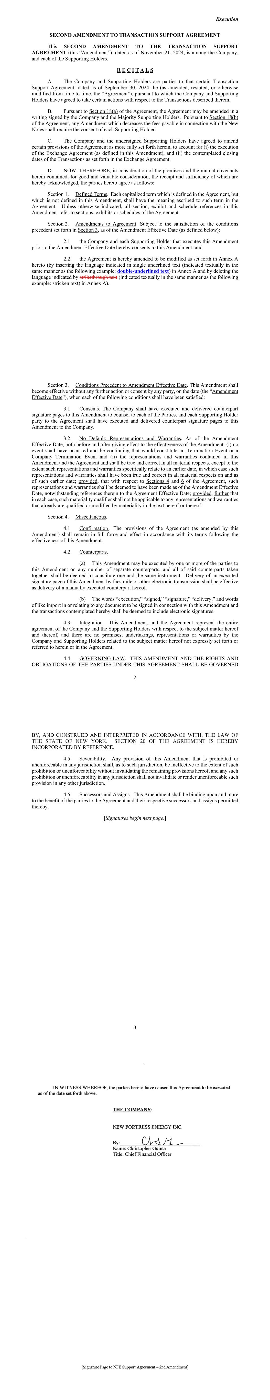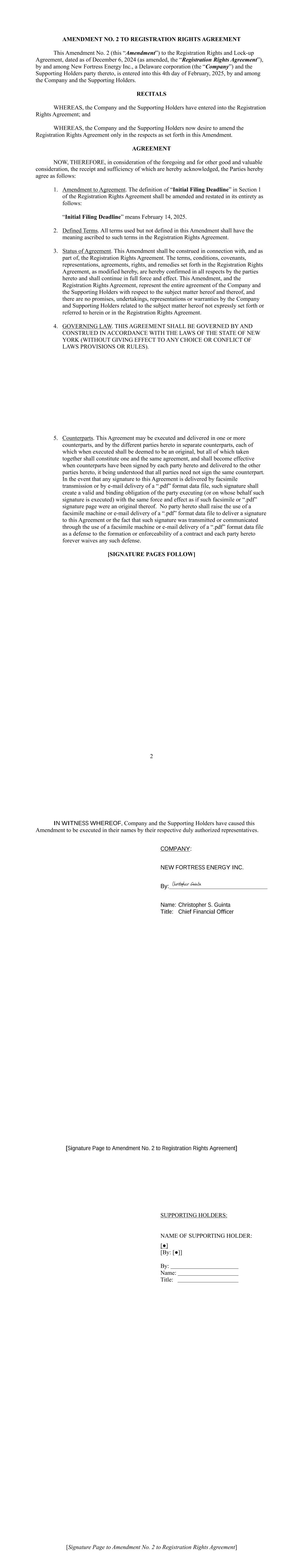 AMENDMENT NO. 2 TO REGISTRATION RIGHTS AGREEMENT This Amendment No. 2 (this “Amendment”) to the Registration Rights and Lock-up Agreement, dated as of December 6, 2024 (as amended, the “Registration Rights Agreement”), by and among New Fortress Energy Inc., a Delaware corporation (the “Company”) and the Supporting Holders party thereto, is entered into this 4th day of February, 2025, by and among the Company and the Supporting Holders. RECITALS WHEREAS, the Company and the Supporting Holders have entered into the Registration Rights Agreement; and WHEREAS, the Company and the Supporting Holders now desire to amend the Registration Rights Agreement only in the respects as set forth in this Amendment. AGREEMENT NOW, THEREFORE, in consideration of the foregoing and for other good and valuable consideration, the receipt and sufficiency of which are hereby acknowledged, the Parties hereby agree as follows: 1. Amendment to Agreement. The definition of “Initial Filing Deadline” in Section 1 of the Registration Rights Agreement shall be amended and restated in its entirety as follows: “Initial Filing Deadline” means February 14, 2025. 2. Defined Terms. All terms used but not defined in this Amendment shall have the meaning ascribed to such terms in the Registration Rights Agreement. 3. Status of Agreement. This Amendment shall be construed in connection with, and as part of, the Registration Rights Agreement. The terms, conditions, covenants, representations, agreements, rights, and remedies set forth in the Registration Rights Agreement, as modified hereby, are hereby confirmed in all respects by the parties hereto and shall continue in full force and effect. This Amendment, and the Registration Rights Agreement, represent the entire agreement of the Company and the Supporting Holders with respect to the subject matter hereof and thereof, and there are no promises, undertakings, representations or warranties by the Company and Supporting Holders related to the subject matter hereof not expressly set forth or referred to herein or in the Registration Rights Agreement. 4. GOVERNING LAW. THIS AGREEMENT SHALL BE GOVERNED BY AND CONSTRUED IN ACCORDANCE WITH THE LAWS OF THE STATE OF NEW YORK (WITHOUT GIVING EFFECT TO ANY CHOICE OR CONFLICT OF LAWS PROVISIONS OR RULES). 2 5. Counterparts. This Agreement may be executed and delivered in one or more counterparts, and by the different parties hereto in separate counterparts, each of which when executed shall be deemed to be an original, but all of which taken together shall constitute one and the same agreement, and shall become effective when counterparts have been signed by each party hereto and delivered to the other parties hereto, it being understood that all parties need not sign the same counterpart. In the event that any signature to this Agreement is delivered by facsimile transmission or by e-mail delivery of a “.pdf” format data file, such signature shall create a valid and binding obligation of the party executing (or on whose behalf such signature is executed) with the same force and effect as if such facsimile or “.pdf” signature page were an original thereof. No party hereto shall raise the use of a facsimile machine or e-mail delivery of a “.pdf” format data file to deliver a signature to this Agreement or the fact that such signature was transmitted or communicated through the use of a facsimile machine or e-mail delivery of a “.pdf” format data file as a defense to the formation or enforceability of a contract and each party hereto forever waives any such defense. [SIGNATURE PAGES FOLLOW] [Signature Page to Amendment No. 2 to Registration Rights Agreement] IN WITNESS WHEREOF, Company and the Supporting Holders have caused this Amendment to be executed in their names by their respective duly authorized representatives. COMPANY: NEW FORTRESS ENERGY INC. By: Name: Christopher S. Guinta Title: Chief Financial Officer [Signature Page to Amendment No. 2 to Registration Rights Agreement] SUPPORTING HOLDERS: NAME OF SUPPORTING HOLDER: [●] [By: [●]] By: Name: Title: