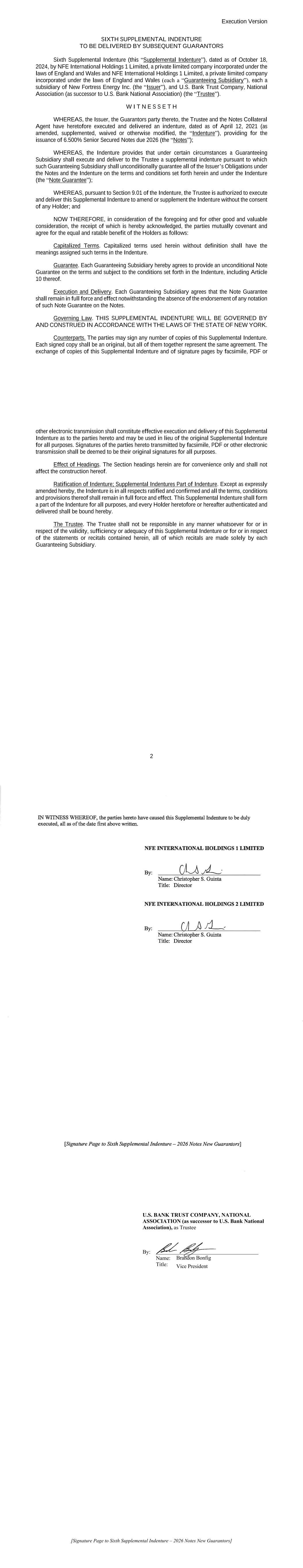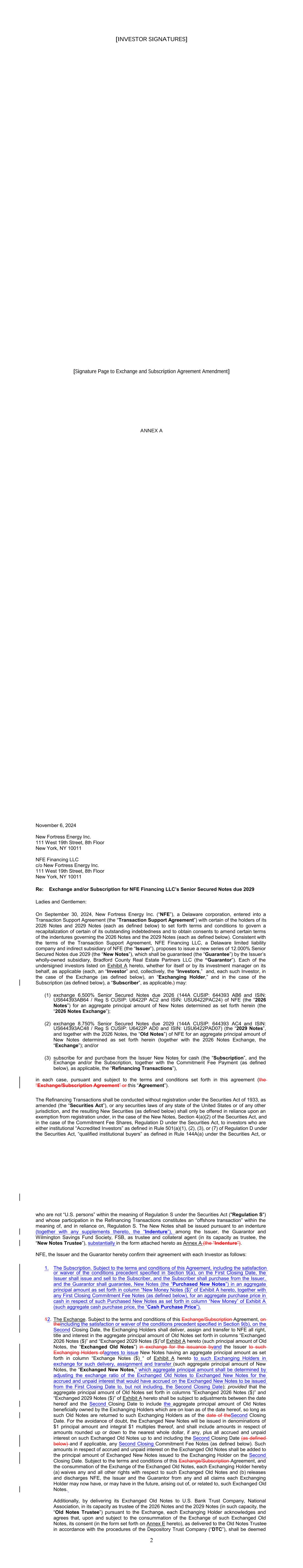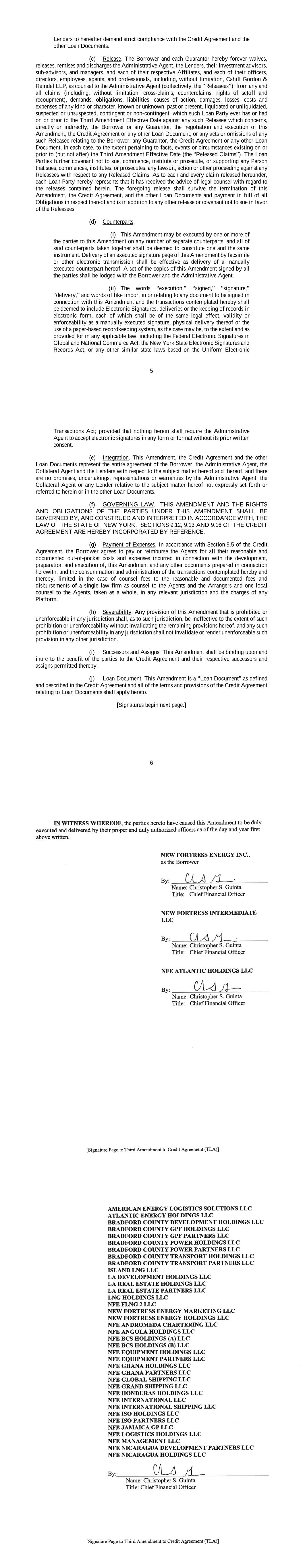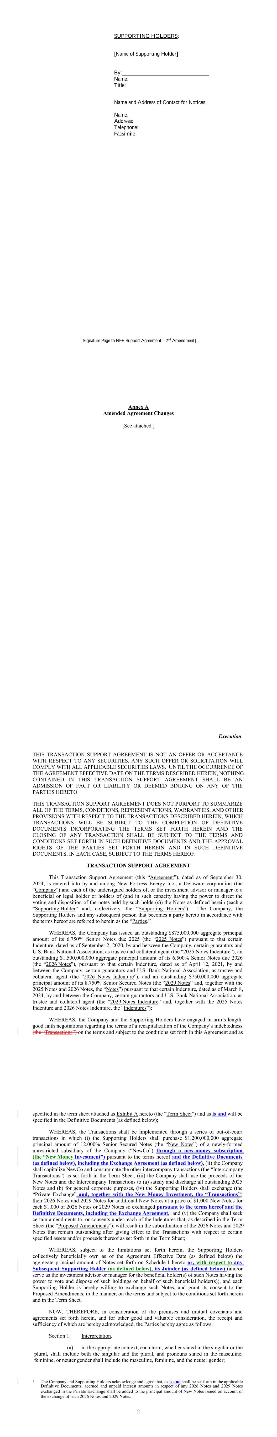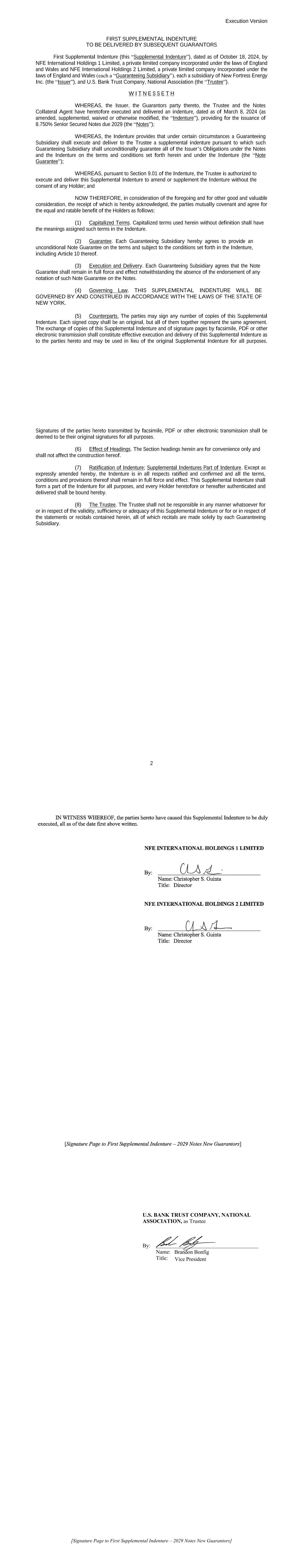 AMENDMENT NO. 2 TO REGISTRATION RIGHTS AGREEMENT This Amendment No. 2 (this “Amendment”) to the Registration Rights and Lock-up Agreement, dated as of December 6, 2024 (as amended, the “Registration Rights Agreement”), by and among New Fortress Energy Inc., a Delaware corporation (the “Company”) and the Supporting Holders party thereto, is entered into this 4th day of February, 2025, by and among the Company and the Supporting Holders. RECITALS WHEREAS, the Company and the Supporting Holders have entered into the Registration Rights Agreement; and WHEREAS, the Company and the Supporting Holders now desire to amend the Registration Rights Agreement only in the respects as set forth in this Amendment. AGREEMENT NOW, THEREFORE, in consideration of the foregoing and for other good and valuable consideration, the receipt and sufficiency of which are hereby acknowledged, the Parties hereby agree as follows: 1. Amendment to Agreement. The definition of “Initial Filing Deadline” in Section 1 of the Registration Rights Agreement shall be amended and restated in its entirety as follows: “Initial Filing Deadline” means February 14, 2025. 2. Defined Terms. All terms used but not defined in this Amendment shall have the meaning ascribed to such terms in the Registration Rights Agreement. 3. Status of Agreement. This Amendment shall be construed in connection with, and as part of, the Registration Rights Agreement. The terms, conditions, covenants, representations, agreements, rights, and remedies set forth in the Registration Rights Agreement, as modified hereby, are hereby confirmed in all respects by the parties hereto and shall continue in full force and effect. This Amendment, and the Registration Rights Agreement, represent the entire agreement of the Company and the Supporting Holders with respect to the subject matter hereof and thereof, and there are no promises, undertakings, representations or warranties by the Company and Supporting Holders related to the subject matter hereof not expressly set forth or referred to herein or in the Registration Rights Agreement. 4. GOVERNING LAW. THIS AGREEMENT SHALL BE GOVERNED BY AND CONSTRUED IN ACCORDANCE WITH THE LAWS OF THE STATE OF NEW YORK (WITHOUT GIVING EFFECT TO ANY CHOICE OR CONFLICT OF LAWS PROVISIONS OR RULES). 2 5. Counterparts. This Agreement may be executed and delivered in one or more counterparts, and by the different parties hereto in separate counterparts, each of which when executed shall be deemed to be an original, but all of which taken together shall constitute one and the same agreement, and shall become effective when counterparts have been signed by each party hereto and delivered to the other parties hereto, it being understood that all parties need not sign the same counterpart. In the event that any signature to this Agreement is delivered by facsimile transmission or by e-mail delivery of a “.pdf” format data file, such signature shall create a valid and binding obligation of the party executing (or on whose behalf such signature is executed) with the same force and effect as if such facsimile or “.pdf” signature page were an original thereof. No party hereto shall raise the use of a facsimile machine or e-mail delivery of a “.pdf” format data file to deliver a signature to this Agreement or the fact that such signature was transmitted or communicated through the use of a facsimile machine or e-mail delivery of a “.pdf” format data file as a defense to the formation or enforceability of a contract and each party hereto forever waives any such defense. [SIGNATURE PAGES FOLLOW] [Signature Page to Amendment No. 2 to Registration Rights Agreement] IN WITNESS WHEREOF, Company and the Supporting Holders have caused this Amendment to be executed in their names by their respective duly authorized representatives. COMPANY: NEW FORTRESS ENERGY INC. By: Name: Christopher S. Guinta Title: Chief Financial Officer [Signature Page to Amendment No. 2 to Registration Rights Agreement] SUPPORTING HOLDERS: NAME OF SUPPORTING HOLDER: [●] [By: [●]] By: Name: Title: