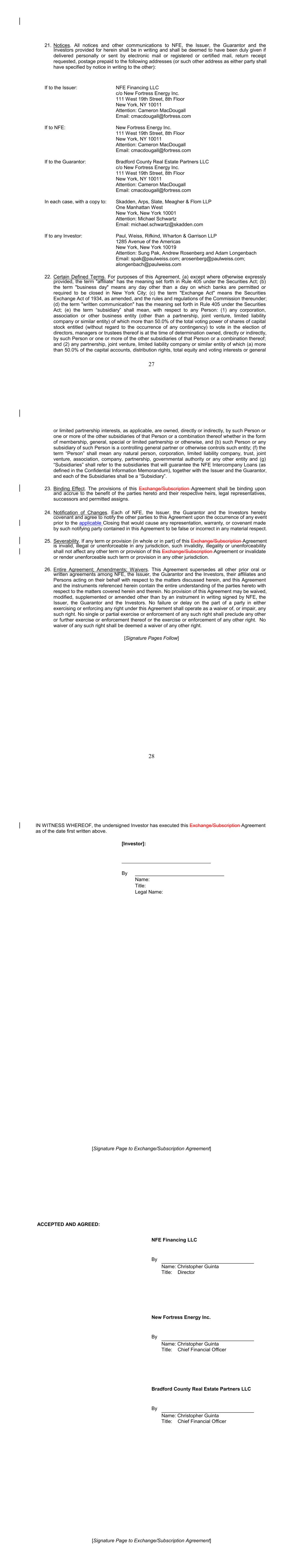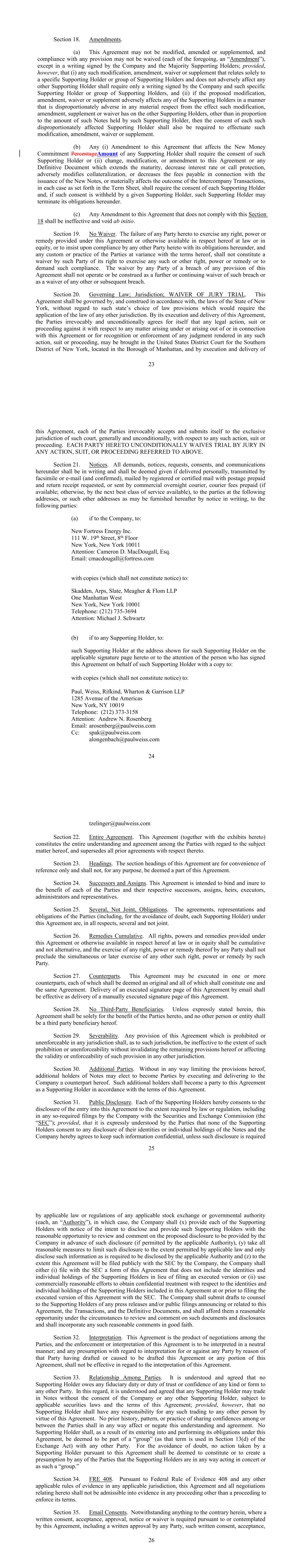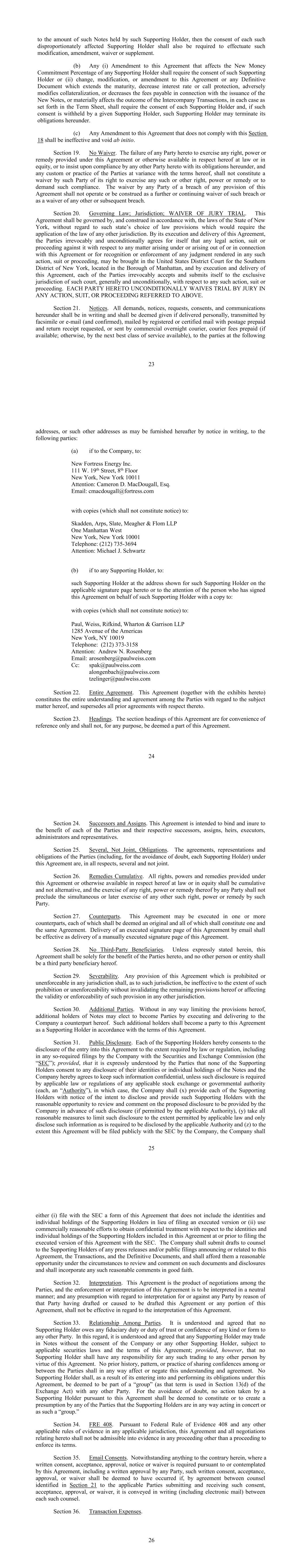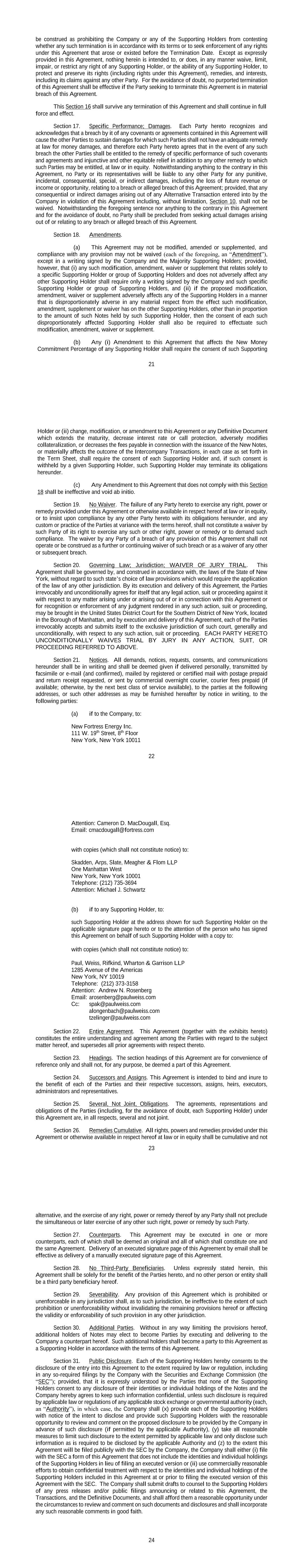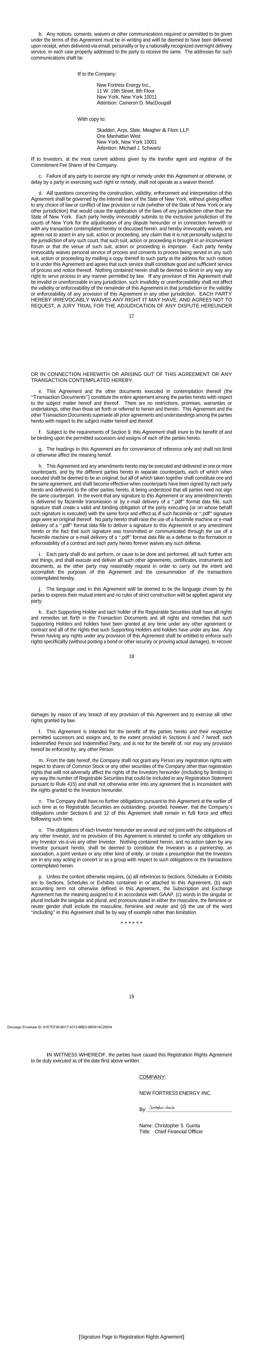 17 b. Any notices, consents, waivers or other communications required or permitted to be given under the terms of this Agreement must be in writing and will be deemed to have been delivered upon receipt, when delivered via email, personally or by a nationally recognized overnight delivery service, in each case properly addressed to the party to receive the same. The addresses for such communications shall be: If to the Company: New Fortress Energy Inc., 11 W. 19th Street, 8th Floor New York, New York 10011 Attention: Cameron D. MacDougall With copy to: Skadden, Arps, Slate, Meagher & Flom LLP One Manhattan West New York, New York 10001 Attention: Michael J. Schwartz If to Investors, at the most current address given by the transfer agent and registrar of the Commitment Fee Shares of the Company. c. Failure of any party to exercise any right or remedy under this Agreement or otherwise, or delay by a party in exercising such right or remedy, shall not operate as a waiver thereof. d. All questions concerning the construction, validity, enforcement and interpretation of this Agreement shall be governed by the internal laws of the State of New York, without giving effect to any choice of law or conflict of law provision or rule (whether of the State of New York or any other jurisdiction) that would cause the application of the laws of any jurisdiction other than the State of New York. Each party hereby irrevocably submits to the exclusive jurisdiction of the courts of New York for the adjudication of any dispute hereunder or in connection herewith or with any transaction contemplated hereby or discussed herein, and hereby irrevocably waives, and agrees not to assert in any suit, action or proceeding, any claim that it is not personally subject to the jurisdiction of any such court, that such suit, action or proceeding is brought in an inconvenient forum or that the venue of such suit, action or proceeding is improper. Each party hereby irrevocably waives personal service of process and consents to process being served in any such suit, action or proceeding by mailing a copy thereof to such party at the address for such notices to it under this Agreement and agrees that such service shall constitute good and sufficient service of process and notice thereof. Nothing contained herein shall be deemed to limit in any way any right to serve process in any manner permitted by law. If any provision of this Agreement shall be invalid or unenforceable in any jurisdiction, such invalidity or unenforceability shall not affect the validity or enforceability of the remainder of this Agreement in that jurisdiction or the validity or enforceability of any provision of this Agreement in any other jurisdiction. EACH PARTY HEREBY IRREVOCABLY WAIVES ANY RIGHT IT MAY HAVE, AND AGREES NOT TO REQUEST, A JURY TRIAL FOR THE ADJUDICATION OF ANY DISPUTE HEREUNDER 18 OR IN CONNECTION HEREWITH OR ARISING OUT OF THIS AGREEMENT OR ANY TRANSACTION CONTEMPLATED HEREBY. e. This Agreement and the other documents executed in contemplation thereof (the “Transaction Documents”) constitute the entire agreement among the parties hereto with respect to the subject matter hereof and thereof. There are no restrictions, promises, warranties or undertakings, other than those set forth or referred to herein and therein. This Agreement and the other Transaction Documents supersede all prior agreements and understandings among the parties hereto with respect to the subject matter hereof and thereof. f. Subject to the requirements of Section 9, this Agreement shall inure to the benefit of and be binding upon the permitted successors and assigns of each of the parties hereto. g. The headings in this Agreement are for convenience of reference only and shall not limit or otherwise affect the meaning hereof. h. This Agreement and any amendments hereto may be executed and delivered in one or more counterparts, and by the different parties hereto in separate counterparts, each of which when executed shall be deemed to be an original, but all of which taken together shall constitute one and the same agreement, and shall become effective when counterparts have been signed by each party hereto and delivered to the other parties hereto, it being understood that all parties need not sign the same counterpart. In the event that any signature to this Agreement or any amendment hereto is delivered by facsimile transmission or by e-mail delivery of a “.pdf” format data file, such signature shall create a valid and binding obligation of the party executing (or on whose behalf such signature is executed) with the same force and effect as if such facsimile or “.pdf” signature page were an original thereof. No party hereto shall raise the use of a facsimile machine or e-mail delivery of a “.pdf” format data file to deliver a signature to this Agreement or any amendment hereto or the fact that such signature was transmitted or communicated through the use of a facsimile machine or e-mail delivery of a “.pdf” format data file as a defense to the formation or enforceability of a contract and each party hereto forever waives any such defense. i. Each party shall do and perform, or cause to be done and performed, all such further acts and things, and shall execute and deliver all such other agreements, certificates, instruments and documents, as the other party may reasonably request in order to carry out the intent and accomplish the purposes of this Agreement and the consummation of the transactions contemplated hereby. j. The language used in this Agreement will be deemed to be the language chosen by the parties to express their mutual intent and no rules of strict construction will be applied against any party. k. Each Supporting Holder and each holder of the Registrable Securities shall have all rights and remedies set forth in the Transaction Documents and all rights and remedies that such Supporting Holders and holders have been granted 