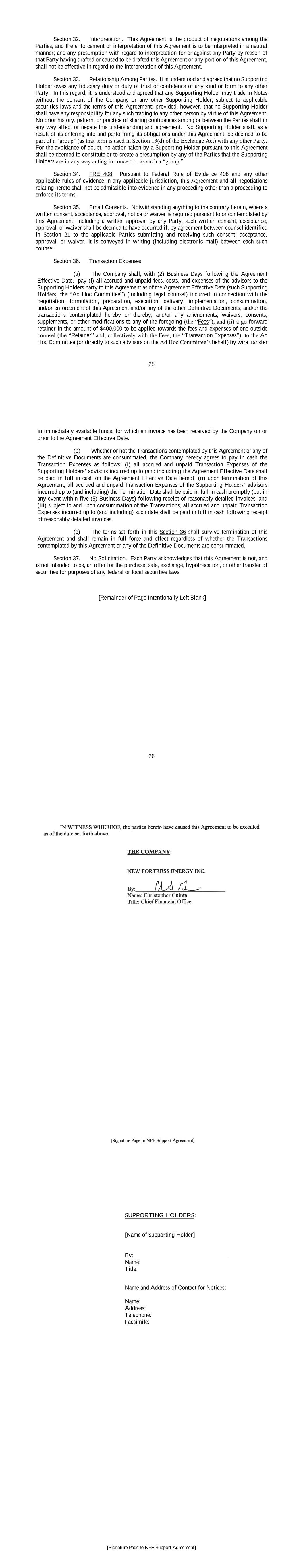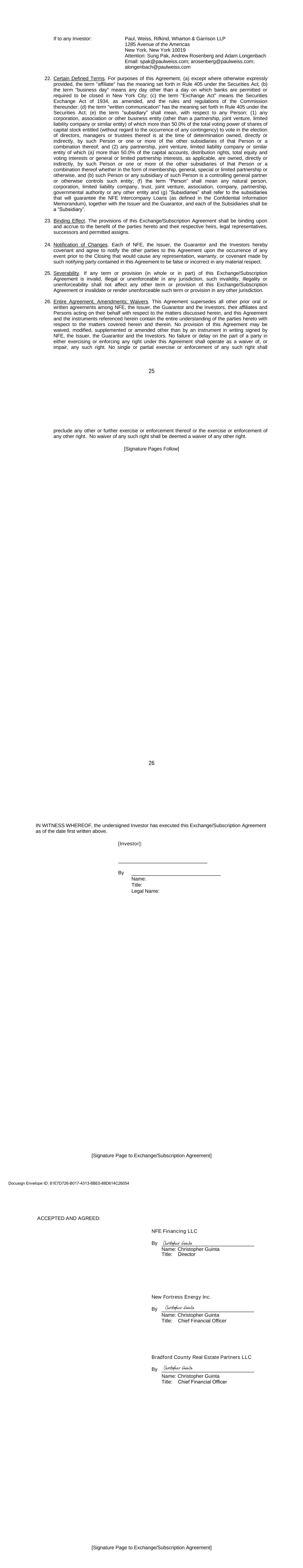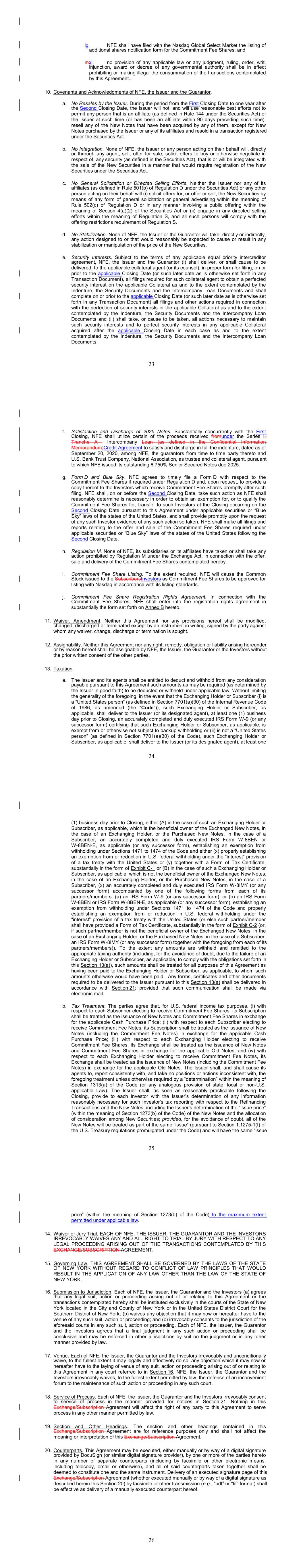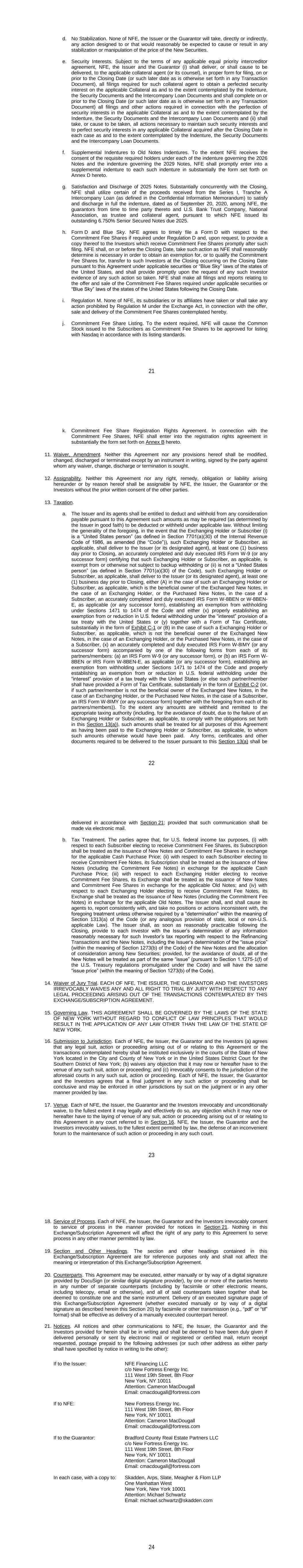 17 b. Any notices, consents, waivers or other communications required or permitted to be given under the terms of this Agreement must be in writing and will be deemed to have been delivered upon receipt, when delivered via email, personally or by a nationally recognized overnight delivery service, in each case properly addressed to the party to receive the same. The addresses for such communications shall be: If to the Company: New Fortress Energy Inc., 11 W. 19th Street, 8th Floor New York, New York 10011 Attention: Cameron D. MacDougall With copy to: Skadden, Arps, Slate, Meagher & Flom LLP One Manhattan West New York, New York 10001 Attention: Michael J. Schwartz If to Investors, at the most current address given by the transfer agent and registrar of the Commitment Fee Shares of the Company. c. Failure of any party to exercise any right or remedy under this Agreement or otherwise, or delay by a party in exercising such right or remedy, shall not operate as a waiver thereof. d. All questions concerning the construction, validity, enforcement and interpretation of this Agreement shall be governed by the internal laws of the State of New York, without giving effect to any choice of law or conflict of law provision or rule (whether of the State of New York or any other jurisdiction) that would cause the application of the laws of any jurisdiction other than the State of New York. Each party hereby irrevocably submits to the exclusive jurisdiction of the courts of New York for the adjudication of any dispute hereunder or in connection herewith or with any transaction contemplated hereby or discussed herein, and hereby irrevocably waives, and agrees not to assert in any suit, action or proceeding, any claim that it is not personally subject to the jurisdiction of any such court, that such suit, action or proceeding is brought in an inconvenient forum or that the venue of such suit, action or proceeding is improper. Each party hereby irrevocably waives personal service of process and consents to process being served in any such suit, action or proceeding by mailing a copy thereof to such party at the address for such notices to it under this Agreement and agrees that such service shall constitute good and sufficient service of process and notice thereof. Nothing contained herein shall be deemed to limit in any way any right to serve process in any manner permitted by law. If any provision of this Agreement shall be invalid or unenforceable in any jurisdiction, such invalidity or unenforceability shall not affect the validity or enforceability of the remainder of this Agreement in that jurisdiction or the validity or enforceability of any provision of this Agreement in any other jurisdiction. EACH PARTY HEREBY IRREVOCABLY WAIVES ANY RIGHT IT MAY HAVE, AND AGREES NOT TO REQUEST, A JURY TRIAL FOR THE ADJUDICATION OF ANY DISPUTE HEREUNDER 18 OR IN CONNECTION HEREWITH OR ARISING OUT OF THIS AGREEMENT OR ANY TRANSACTION CONTEMPLATED HEREBY. e. This Agreement and the other documents executed in contemplation thereof (the “Transaction Documents”) constitute the entire agreement among the parties hereto with respect to the subject matter hereof and thereof. There are no restrictions, promises, warranties or undertakings, other than those set forth or referred to herein and therein. This Agreement and the other Transaction Documents supersede all prior agreements and understandings among the parties hereto with respect to the subject matter hereof and thereof. f. Subject to the requirements of Section 9, this Agreement shall inure to the benefit of and be binding upon the permitted successors and assigns of each of the parties hereto. g. The headings in this Agreement are for convenience of reference only and shall not limit or otherwise affect the meaning hereof. h. This Agreement and any amendments hereto may be executed and delivered in one or more counterparts, and by the different parties hereto in separate counterparts, each of which when executed shall be deemed to be an original, but all of which taken together shall constitute one and the same agreement, and shall become effective when counterparts have been signed by each party hereto and delivered to the other parties hereto, it being understood that all parties need not sign the same counterpart. In the event that any signature to this Agreement or any amendment hereto is delivered by facsimile transmission or by e-mail delivery of a “.pdf” format data file, such signature shall create a valid and binding obligation of the party executing (or on whose behalf such signature is executed) with the same force and effect as if such facsimile or “.pdf” signature page were an original thereof. No party hereto shall raise the use of a facsimile machine or e-mail delivery of a “.pdf” format data file to deliver a signature to this Agreement or any amendment hereto or the fact that such signature was transmitted or communicated through the use of a facsimile machine or e-mail delivery of a “.pdf” format data file as a defense to the formation or enforceability of a contract and each party hereto forever waives any such defense. i. Each party shall do and perform, or cause to be done and performed, all such further acts and things, and shall execute and deliver all such other agreements, certificates, instruments and documents, as the other party may reasonably request in order to carry out the intent and accomplish the purposes of this Agreement and the consummation of the transactions contemplated hereby. j. The language used in this Agreement will be deemed to be the language chosen by the parties to express their mutual intent and no rules of strict construction will be applied against any party. k. Each Supporting Holder and each holder of the Registrable Securities shall have all rights and remedies set forth in the Transaction Documents and all rights and remedies that such Supporting Holders and holders have been granted 