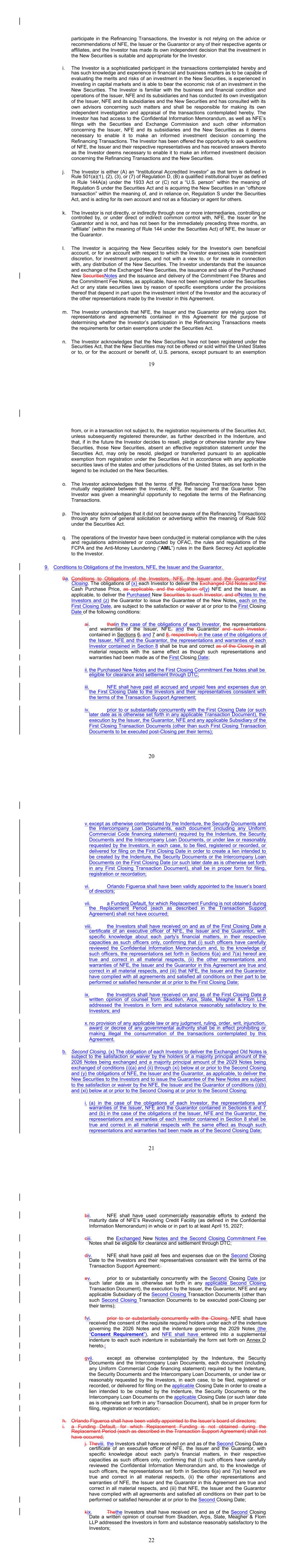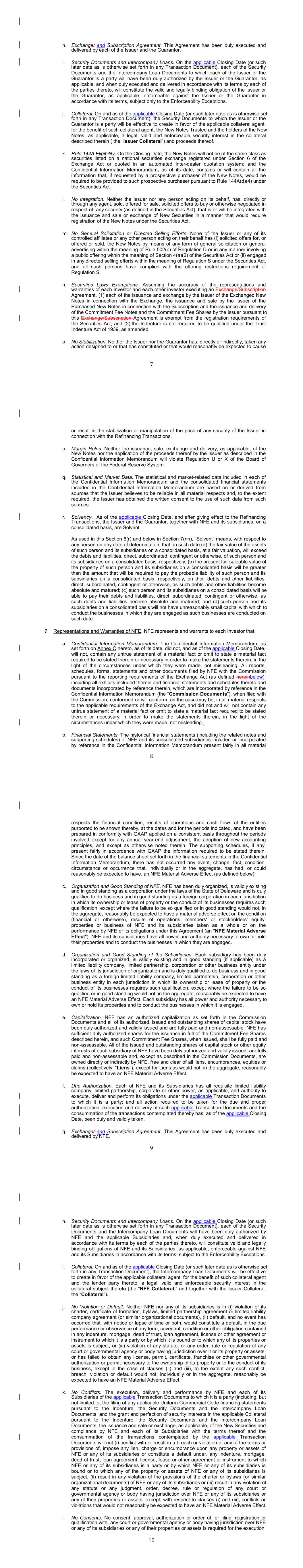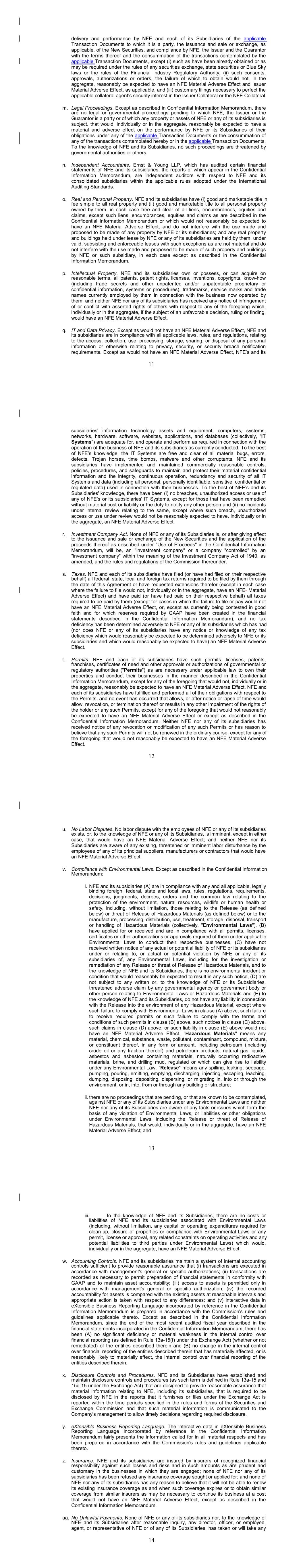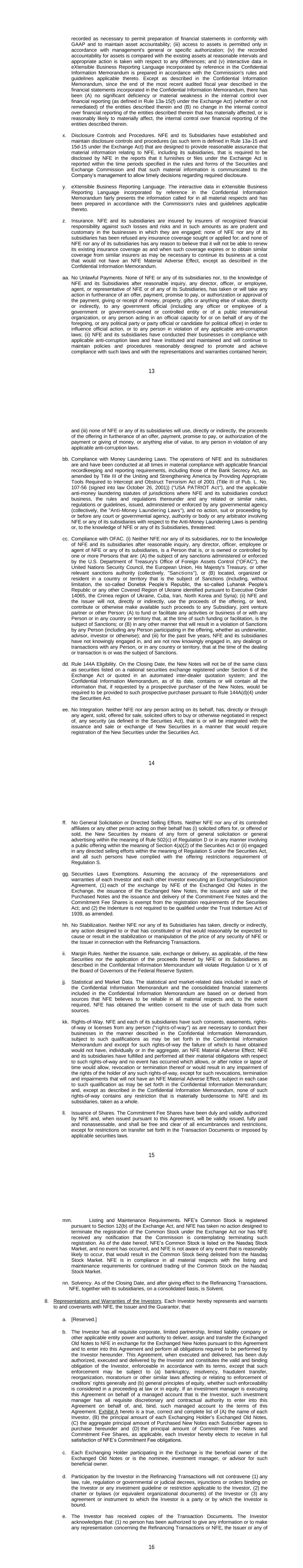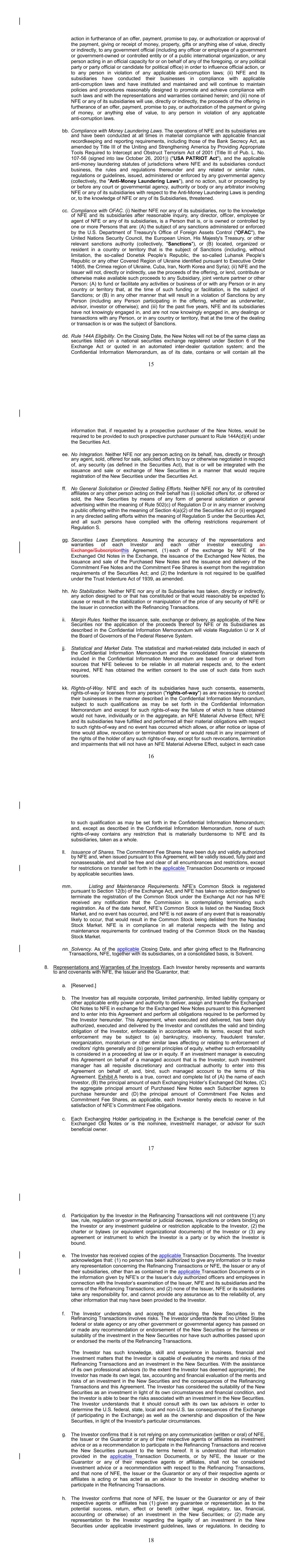 17 b. Any notices, consents, waivers or other communications required or permitted to be given under the terms of this Agreement must be in writing and will be deemed to have been delivered upon receipt, when delivered via email, personally or by a nationally recognized overnight delivery service, in each case properly addressed to the party to receive the same. The addresses for such communications shall be: If to the Company: New Fortress Energy Inc., 11 W. 19th Street, 8th Floor New York, New York 10011 Attention: Cameron D. MacDougall With copy to: Skadden, Arps, Slate, Meagher & Flom LLP One Manhattan West New York, New York 10001 Attention: Michael J. Schwartz If to Investors, at the most current address given by the transfer agent and registrar of the Commitment Fee Shares of the Company. c. Failure of any party to exercise any right or remedy under this Agreement or otherwise, or delay by a party in exercising such right or remedy, shall not operate as a waiver thereof. d. All questions concerning the construction, validity, enforcement and interpretation of this Agreement shall be governed by the internal laws of the State of New York, without giving effect to any choice of law or conflict of law provision or rule (whether of the State of New York or any other jurisdiction) that would cause the application of the laws of any jurisdiction other than the State of New York. Each party hereby irrevocably submits to the exclusive jurisdiction of the courts of New York for the adjudication of any dispute hereunder or in connection herewith or with any transaction contemplated hereby or discussed herein, and hereby irrevocably waives, and agrees not to assert in any suit, action or proceeding, any claim that it is not personally subject to the jurisdiction of any such court, that such suit, action or proceeding is brought in an inconvenient forum or that the venue of such suit, action or proceeding is improper. Each party hereby irrevocably waives personal service of process and consents to process being served in any such suit, action or proceeding by mailing a copy thereof to such party at the address for such notices to it under this Agreement and agrees that such service shall constitute good and sufficient service of process and notice thereof. Nothing contained herein shall be deemed to limit in any way any right to serve process in any manner permitted by law. If any provision of this Agreement shall be invalid or unenforceable in any jurisdiction, such invalidity or unenforceability shall not affect the validity or enforceability of the remainder of this Agreement in that jurisdiction or the validity or enforceability of any provision of this Agreement in any other jurisdiction. EACH PARTY HEREBY IRREVOCABLY WAIVES ANY RIGHT IT MAY HAVE, AND AGREES NOT TO REQUEST, A JURY TRIAL FOR THE ADJUDICATION OF ANY DISPUTE HEREUNDER 18 OR IN CONNECTION HEREWITH OR ARISING OUT OF THIS AGREEMENT OR ANY TRANSACTION CONTEMPLATED HEREBY. e. This Agreement and the other documents executed in contemplation thereof (the “Transaction Documents”) constitute the entire agreement among the parties hereto with respect to the subject matter hereof and thereof. There are no restrictions, promises, warranties or undertakings, other than those set forth or referred to herein and therein. This Agreement and the other Transaction Documents supersede all prior agreements and understandings among the parties hereto with respect to the subject matter hereof and thereof. f. Subject to the requirements of Section 9, this Agreement shall inure to the benefit of and be binding upon the permitted successors and assigns of each of the parties hereto. g. The headings in this Agreement are for convenience of reference only and shall not limit or otherwise affect the meaning hereof. h. This Agreement and any amendments hereto may be executed and delivered in one or more counterparts, and by the different parties hereto in separate counterparts, each of which when executed shall be deemed to be an original, but all of which taken together shall constitute one and the same agreement, and shall become effective when counterparts have been signed by each party hereto and delivered to the other parties hereto, it being understood that all parties need not sign the same counterpart. In the event that any signature to this Agreement or any amendment hereto is delivered by facsimile transmission or by e-mail delivery of a “.pdf” format data file, such signature shall create a valid and binding obligation of the party executing (or on whose behalf such signature is executed) with the same force and effect as if such facsimile or “.pdf” signature page were an original thereof. No party hereto shall raise the use of a facsimile machine or e-mail delivery of a “.pdf” format data file to deliver a signature to this Agreement or any amendment hereto or the fact that such signature was transmitted or communicated through the use of a facsimile machine or e-mail delivery of a “.pdf” format data file as a defense to the formation or enforceability of a contract and each party hereto forever waives any such defense. i. Each party shall do and perform, or cause to be done and performed, all such further acts and things, and shall execute and deliver all such other agreements, certificates, instruments and documents, as the other party may reasonably request in order to carry out the intent and accomplish the purposes of this Agreement and the consummation of the transactions contemplated hereby. j. The language used in this Agreement will be deemed to be the language chosen by the parties to express their mutual intent and no rules of strict construction will be applied against any party. k. Each Supporting Holder and each holder of the Registrable Securities shall have all rights and remedies set forth in the Transaction Documents and all rights and remedies that such Supporting Holders and holders have been granted 