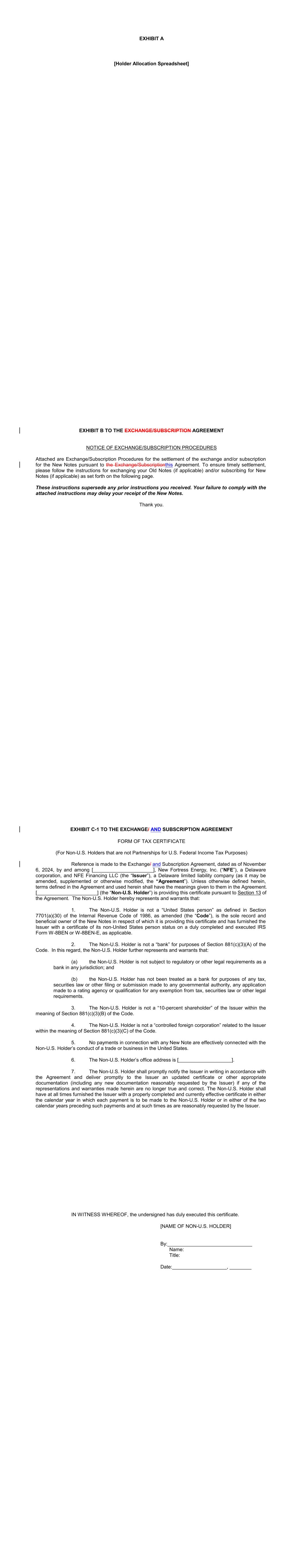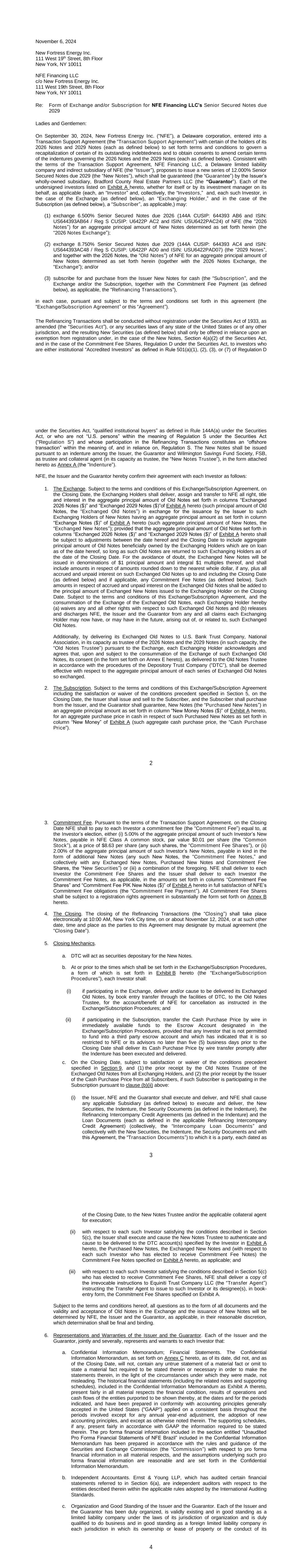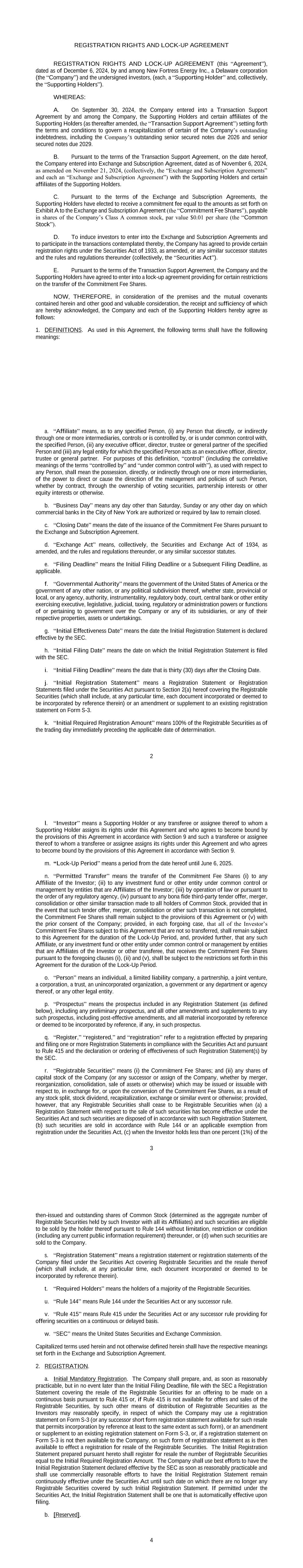 REGISTRATION RIGHTS AND LOCK-UP AGREEMENT REGISTRATION RIGHTS AND LOCK-UP AGREEMENT (this “Agreement”), dated as of December 6, 2024, by and among New Fortress Energy Inc., a Delaware corporation (the “Company”) and the undersigned investors, (each, a “Supporting Holder” and, collectively, the “Supporting Holders”). WHEREAS: A. On September 30, 2024, the Company entered into a Transaction Support Agreement by and among the Company, the Supporting Holders and certain affiliates of the Supporting Holders (as thereafter amended, the “Transaction Support Agreement”) setting forth the terms and conditions to govern a recapitalization of certain of the Company’s outstanding indebtedness, including the Company’s outstanding senior secured notes due 2026 and senior secured notes due 2029. B. Pursuant to the terms of the Transaction Support Agreement, on the date hereof, the Company entered into Exchange and Subscription Agreement, dated as of November 6, 2024, as amended on November 21, 2024, (collectively, the “Exchange and Subscription Agreements” and each an “Exchange and Subscription Agreement”) with the Supporting Holders and certain affiliates of the Supporting Holders. C. Pursuant to the terms of the Exchange and Subscription Agreements, the Supporting Holders have elected to receive a commitment fee equal to the amounts as set forth on Exhibit A to the Exchange and Subscription Agreement (the “Commitment Fee Shares”), payable in shares of the Company’s Class A common stock, par value $0.01 per share (the “Common Stock”). D. To induce investors to enter into the Exchange and Subscription Agreements and to participate in the transactions contemplated thereby, the Company has agreed to provide certain registration rights under the Securities Act of 1933, as amended, or any similar successor statutes and the rules and regulations thereunder (collectively, the “Securities Act”). E. Pursuant to the terms of the Transaction Support Agreement, the Company and the Supporting Holders have agreed to enter into a lock-up agreement providing for certain restrictions on the transfer of the Commitment Fee Shares. NOW, THEREFORE, in consideration of the premises and the mutual covenants contained herein and other good and valuable consideration, the receipt and sufficiency of which are hereby acknowledged, the Company and each of the Supporting Holders hereby agree as follows: 1. DEFINITIONS. As used in this Agreement, the following terms shall have the following meanings: 2 a. “Affiliate” means, as to any specified Person, (i) any Person that directly, or indirectly through one or more intermediaries, controls or is controlled by, or is under common control with, the specified Person, (ii) any executive officer, director, trustee or general partner of the specified Person and (iii) any legal entity for which the specified Person acts as an executive officer, director, trustee or general partner. For purposes of this definition, “control” (including the correlative meanings of the terms “controlled by” and “under common control with”), as used with respect to any Person, shall mean the possession, directly, or indirectly through one or more intermediaries, of the power to direct or cause the direction of the management and policies of such Person, whether by contract, through the ownership of voting securities, partnership interests or other equity interests or otherwise. b. “Business Day” means any day other than Saturday, Sunday or any other day on which commercial banks in the City of New York are authorized or required by law to remain closed. c. “Closing Date” means the date of the issuance of the Commitment Fee Shares pursuant to the Exchange and Subscription Agreement. d. “Exchange Act” means, collectively, the Securities and Exchange Act of 1934, as amended, and the rules and regulations thereunder, or any similar successor statutes. e. “Filing Deadline” means the Initial Filing Deadline or a Subsequent Filing Deadline, as applicable. f. “Governmental Authority” means the government of the United States of America or the government of any other nation, or any political subdivision thereof, whether state, provincial or local, or any agency, authority, instrumentality, regulatory body, court, central bank or other entity exercising executive, legislative, judicial, taxing, regulatory or administration powers or functions of or pertaining to government over the Company or any of its subsidiaries, or any of their respective properties, assets or undertakings. g. “Initial Effectiveness Date” means the date the Initial Registration Statement is declared effective by the SEC. h. “Initial Filing Date” means the date on which the Initial Registration Statement is filed with the SEC. i. “Initial Filing Deadline” means the date that is thirty (30) days after the Closing Date. j. “Initial Registration Statement” means a Registration Statement or Registration Statements filed under the Securities Act pursuant to Section 2(a) hereof covering the Registrable Securities (which shall include, at any particular time, each document incorporated or deemed to be incorporated by reference therein) or an amendment or supplement to an existing registration statement on Form S-3. k. “Initial Required Registration Amount” means 100% of the Registrable Securities as of the trading day immediately preceding the applicable date of determination. 3 l. “Investor” means a Supporting Holder or any transferee or assignee thereof to whom a Supporting Holder assigns its rights under this Agreement and who agrees to become bound by the provisions of this Agreement in accordance with Section 9 and such a transferee or assignee thereof to whom a transferee or assignee assigns its rights under this Agreement and who agrees to become bound by the provisions of this Agreement in accordance with Section 9. m. “Lock-Up Period” mea