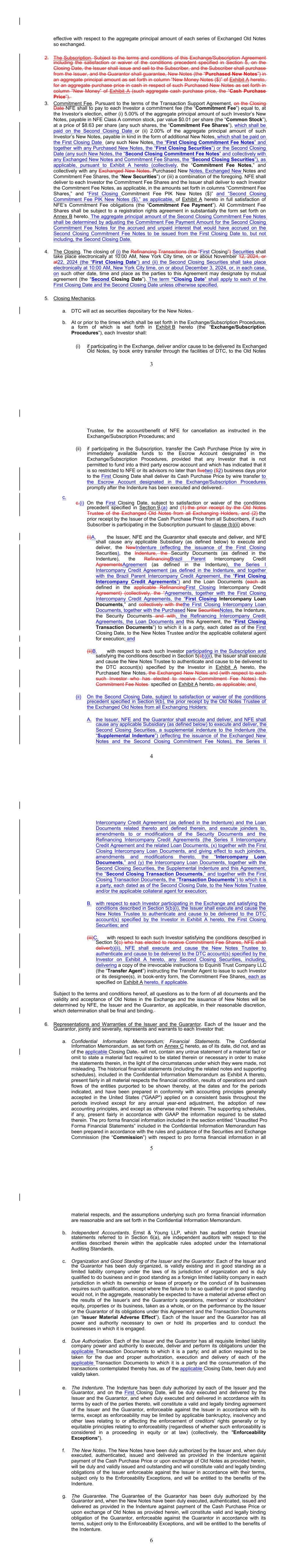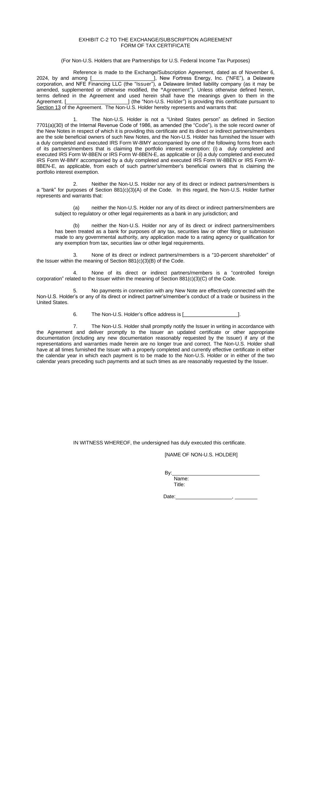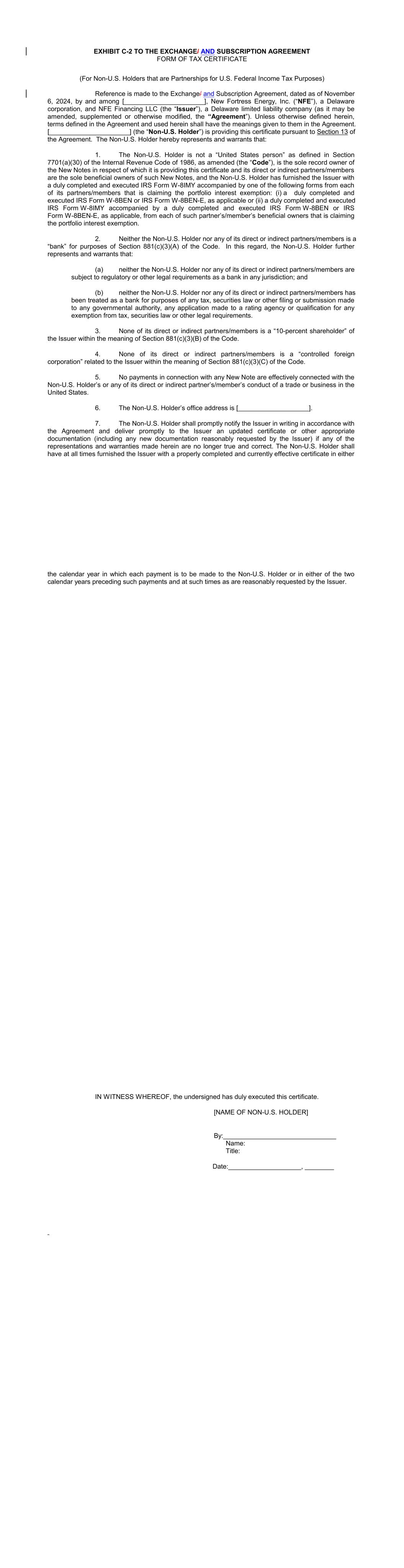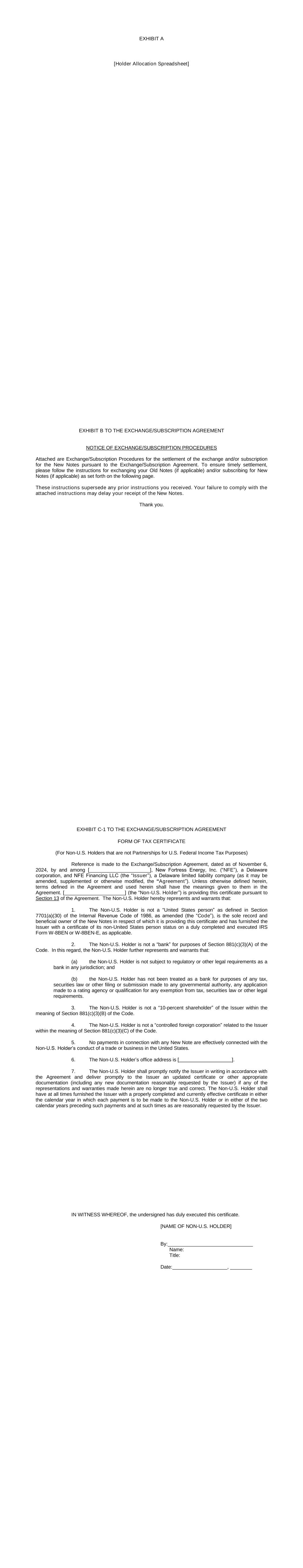 REGISTRATION RIGHTS AND LOCK-UP AGREEMENT REGISTRATION RIGHTS AND LOCK-UP AGREEMENT (this “Agreement”), dated as of December 6, 2024, by and among New Fortress Energy Inc., a Delaware corporation (the “Company”) and the undersigned investors, (each, a “Supporting Holder” and, collectively, the “Supporting Holders”). WHEREAS: A. On September 30, 2024, the Company entered into a Transaction Support Agreement by and among the Company, the Supporting Holders and certain affiliates of the Supporting Holders (as thereafter amended, the “Transaction Support Agreement”) setting forth the terms and conditions to govern a recapitalization of certain of the Company’s outstanding indebtedness, including the Company’s outstanding senior secured notes due 2026 and senior secured notes due 2029. B. Pursuant to the terms of the Transaction Support Agreement, on the date hereof, the Company entered into Exchange and Subscription Agreement, dated as of November 6, 2024, as amended on November 21, 2024, (collectively, the “Exchange and Subscription Agreements” and each an “Exchange and Subscription Agreement”) with the Supporting Holders and certain affiliates of the Supporting Holders. C. Pursuant to the terms of the Exchange and Subscription Agreements, the Supporting Holders have elected to receive a commitment fee equal to the amounts as set forth on Exhibit A to the Exchange and Subscription Agreement (the “Commitment Fee Shares”), payable in shares of the Company’s Class A common stock, par value $0.01 per share (the “Common Stock”). D. To induce investors to enter into the Exchange and Subscription Agreements and to participate in the transactions contemplated thereby, the Company has agreed to provide certain registration rights under the Securities Act of 1933, as amended, or any similar successor statutes and the rules and regulations thereunder (collectively, the “Securities Act”). E. Pursuant to the terms of the Transaction Support Agreement, the Company and the Supporting Holders have agreed to enter into a lock-up agreement providing for certain restrictions on the transfer of the Commitment Fee Shares. NOW, THEREFORE, in consideration of the premises and the mutual covenants contained herein and other good and valuable consideration, the receipt and sufficiency of which are hereby acknowledged, the Company and each of the Supporting Holders hereby agree as follows: 1. DEFINITIONS. As used in this Agreement, the following terms shall have the following meanings: 2 a. “Affiliate” means, as to any specified Person, (i) any Person that directly, or indirectly through one or more intermediaries, controls or is controlled by, or is under common control with, the specified Person, (ii) any executive officer, director, trustee or general partner of the specified Person and (iii) any legal entity for which the specified Person acts as an executive officer, director, trustee or general partner. For purposes of this definition, “control” (including the correlative meanings of the terms “controlled by” and “under common control with”), as used with respect to any Person, shall mean the possession, directly, or indirectly through one or more intermediaries, of the power to direct or cause the direction of the management and policies of such Person, whether by contract, through the ownership of voting securities, partnership interests or other equity interests or otherwise. b. “Business Day” means any day other than Saturday, Sunday or any other day on which commercial banks in the City of New York are authorized or required by law to remain closed. c. “Closing Date” means the date of the issuance of the Commitment Fee Shares pursuant to the Exchange and Subscription Agreement. d. “Exchange Act” means, collectively, the Securities and Exchange Act of 1934, as amended, and the rules and regulations thereunder, or any similar successor statutes. e. “Filing Deadline” means the Initial Filing Deadline or a Subsequent Filing Deadline, as applicable. f. “Governmental Authority” means the government of the United States of America or the government of any other nation, or any political subdivision thereof, whether state, provincial or local, or any agency, authority, instrumentality, regulatory body, court, central bank or other entity exercising executive, legislative, judicial, taxing, regulatory or administration powers or functions of or pertaining to government over the Company or any of its subsidiaries, or any of their respective properties, assets or undertakings. g. “Initial Effectiveness Date” means the date the Initial Registration Statement is declared effective by the SEC. h. “Initial Filing Date” means the date on which the Initial Registration Statement is filed with the SEC. i. “Initial Filing Deadline” means the date that is thirty (30) days after the Closing Date. j. “Initial Registration Statement” means a Registration Statement or Registration Statements filed under the Securities Act pursuant to Section 2(a) hereof covering the Registrable Securities (which shall include, at any particular time, each document incorporated or deemed to be incorporated by reference therein) or an amendment or supplement to an existing registration statement on Form S-3. k. “Initial Required Registration Amount” means 100% of the Registrable Securities as of the trading day immediately preceding the applicable date of determination. 3 l. “Investor” means a Supporting Holder or any transferee or assignee thereof to whom a Supporting Holder assigns its rights under this Agreement and who agrees to become bound by the provisions of this Agreement in accordance with Section 9 and such a transferee or assignee thereof to whom a transferee or assignee assigns its rights under this Agreement and who agrees to become bound by the provisions of this Agreement in accordance with Section 9. m. “Lock-Up Period” mea