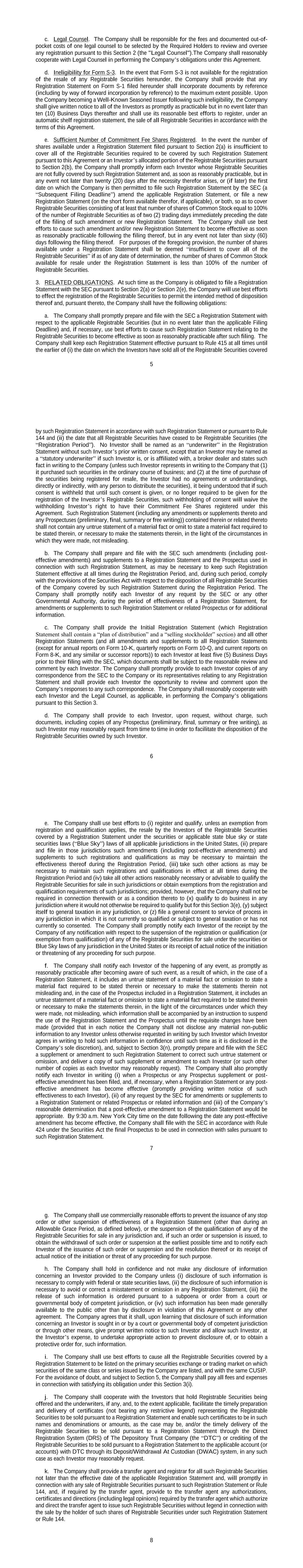 5 c. Legal Counsel. The Company shall be responsible for the fees and documented out-of- pocket costs of one legal counsel to be selected by the Required Holders to review and oversee any registration pursuant to this Section 2 (the "Legal Counsel").The Company shall reasonably cooperate with Legal Counsel in performing the Company’s obligations under this Agreement. d. Ineligibility for Form S-3. In the event that Form S-3 is not available for the registration of the resale of any Registrable Securities hereunder, the Company shall provide that any Registration Statement on Form S-1 filed hereunder shall incorporate documents by reference (including by way of forward incorporation by reference) to the maximum extent possible. Upon the Company becoming a Well-Known Seasoned Issuer following such ineligibility, the Company shall give written notice to all of the Investors as promptly as practicable but in no event later than ten (10) Business Days thereafter and shall use its reasonable best efforts to register, under an automatic shelf registration statement, the sale of all Registrable Securities in accordance with the terms of this Agreement. e. Sufficient Number of Commitment Fee Shares Registered. In the event the number of shares available under a Registration Statement filed pursuant to Section 2(a) is insufficient to cover all of the Registrable Securities required to be covered by such Registration Statement pursuant to this Agreement or an Investor’s allocated portion of the Registrable Securities pursuant to Section 2(b), the Company shall promptly inform each Investor whose Registrable Securities are not fully covered by such Registration Statement and, as soon as reasonably practicable, but in any event not later than twenty (20) days after the necessity therefor arises, or (if later) the first date on which the Company is then permitted to file such Registration Statement by the SEC (a “Subsequent Filing Deadline”) amend the applicable Registration Statement, or file a new Registration Statement (on the short form available therefor, if applicable), or both, so as to cover Registrable Securities consisting of at least that number of shares of Common Stock equal to 100% of the number of Registrable Securities as of two (2) trading days immediately preceding the date of the filing of such amendment or new Registration Statement. The Company shall use best efforts to cause such amendment and/or new Registration Statement to become effective as soon as reasonably practicable following the filing thereof, but in any event not later than sixty (60) days following the filing thereof. For purposes of the foregoing provision, the number of shares available under a Registration Statement shall be deemed “insufficient to cover all of the Registrable Securities” if as of any date of determination, the number of shares of Common Stock available for resale under the Registration Statement is less than 100% of the number of Registrable Securities. 3. RELATED OBLIGATIONS. At such time as the Company is obligated to file a Registration Statement with the SEC pursuant to Section 2(a) or Section 2(e), the Company will use best efforts to effect the registration of the Registrable Securities to permit the intended method of disposition thereof and, pursuant thereto, the Company shall have the following obligations: a. The Company shall promptly prepare and file with the SEC a Registration Statement with respect to the applicable Registrable Securities (but in no event later than the applicable Filing Deadline) and, if necessary, use best efforts to cause such Registration Statement relating to the Registrable Securities to become effective as soon as reasonably practicable after such filing. The Company shall keep each Registration Statement effective pursuant to Rule 415 at all times until the earlier of (i) the date on which the Investors have sold all of the Registrable Securities covered 6 by such Registration Statement in accordance with such Registration Statement or pursuant to Rule 144 and (ii) the date that all Registrable Securities have ceased to be Registrable Securities (the “Registration Period”). No Investor shall be named as an “underwriter” in the Registration Statement without such Investor’s prior written consent, except that an Investor may be named as a “statutory underwriter” if such Investor is, or is affiliated with, a broker dealer and states such fact in writing to the Company (unless such Investor represents in writing to the Company that (1) it purchased such securities in the ordinary course of business; and (2) at the time of purchase of the securities being registered for resale, the Investor had no agreements or understandings, directly or indirectly, with any person to distribute the securities), it being understood that if such consent is withheld that until such consent is given, or no longer required to be given for the registration of the Investor’s Registrable Securities, such withholding of consent will waive the withholding Investor’s right to have their Commitment Fee Shares registered under this Agreement. Such Registration Statement (including any amendments or supplements thereto and any Prospectuses (preliminary, final, summary or free writing)) contained therein or related thereto shall not contain any untrue statement of a material fact or omit to state a material fact required to be stated therein, or necessary to make the statements therein, in the light of the circumstances in which they were made, not misleading. b. The Company shall prepare and file with the SEC such amendments (including post- effective amendments) and supplements to a Registration Statement and the Prospectus used in connection with such Registration Statement, as may be necessary to keep such Registration Statement effective at all times during the Registration Period, and, during such period, comply with the provisions of the Securities Act wi