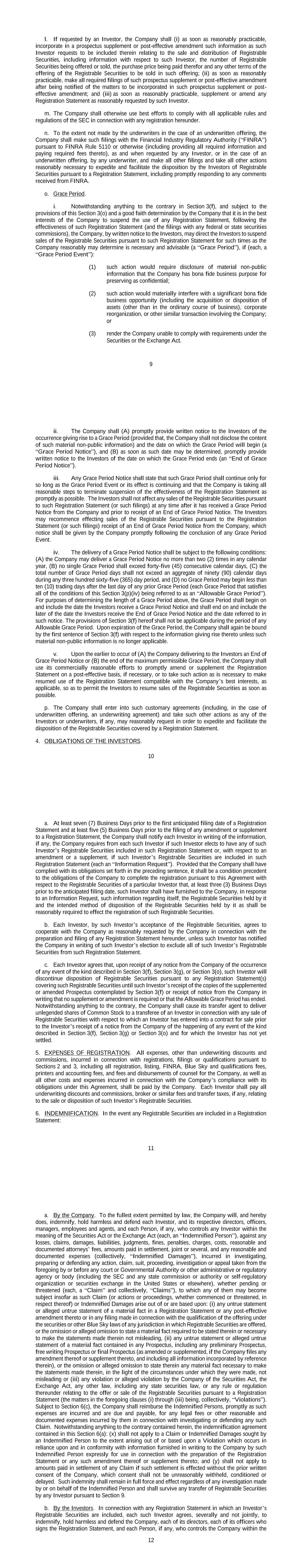 9 l. If requested by an Investor, the Company shall (i) as soon as reasonably practicable, incorporate in a prospectus supplement or post-effective amendment such information as such Investor requests to be included therein relating to the sale and distribution of Registrable Securities, including information with respect to such Investor, the number of Registrable Securities being offered or sold, the purchase price being paid therefor and any other terms of the offering of the Registrable Securities to be sold in such offering; (ii) as soon as reasonably practicable, make all required filings of such prospectus supplement or post-effective amendment after being notified of the matters to be incorporated in such prospectus supplement or post- effective amendment; and (iii) as soon as reasonably practicable, supplement or amend any Registration Statement as reasonably requested by such Investor. m. The Company shall otherwise use best efforts to comply with all applicable rules and regulations of the SEC in connection with any registration hereunder. n. To the extent not made by the underwriters in the case of an underwritten offering, the Company shall make such filings with the Financial Industry Regulatory Authority (“FINRA”) pursuant to FINRA Rule 5110 or otherwise (including providing all required information and paying required fees thereto), as and when requested by any Investor, or in the case of an underwritten offering, by any underwriter, and make all other filings and take all other actions reasonably necessary to expedite and facilitate the disposition by the Investors of Registrable Securities pursuant to a Registration Statement, including promptly responding to any comments received from FINRA. o. Grace Period. i. Notwithstanding anything to the contrary in Section 3(f), and subject to the provisions of this Section 3(o) and a good faith determination by the Company that it is in the best interests of the Company to suspend the use of any Registration Statement, following the effectiveness of such Registration Statement (and the filings with any federal or state securities commissions), the Company, by written notice to the Investors, may direct the Investors to suspend sales of the Registrable Securities pursuant to such Registration Statement for such times as the Company reasonably may determine is necessary and advisable (a “Grace Period”), if (each, a “Grace Period Event”): (1) such action would require disclosure of material non-public information that the Company has bona fide business purpose for preserving as confidential; (2) such action would materially interfere with a significant bona fide business opportunity (including the acquisition or disposition of assets (other than in the ordinary course of business), corporate reorganization, or other similar transaction involving the Company; or (3) render the Company unable to comply with requirements under the Securities or the Exchange Act. 10 ii. The Company shall (A) promptly provide written notice to the Investors of the occurrence giving rise to a Grace Period (provided that, the Company shall not disclose the content of such material non-public information) and the date on which the Grace Period will begin (a “Grace Period Notice”), and (B) as soon as such date may be determined, promptly provide written notice to the Investors of the date on which the Grace Period ends (an “End of Grace Period Notice”). iii. Any Grace Period Notice shall state that such Grace Period shall continue only for so long as the Grace Period Event or its effect is continuing and that the Company is taking all reasonable steps to terminate suspension of the effectiveness of the Registration Statement as promptly as possible. The Investors shall not affect any sales of the Registrable Securities pursuant to such Registration Statement (or such filings) at any time after it has received a Grace Period Notice from the Company and prior to receipt of an End of Grace Period Notice. The Investors may recommence effecting sales of the Registrable Securities pursuant to the Registration Statement (or such filings) receipt of an End of Grace Period Notice from the Company, which notice shall be given by the Company promptly following the conclusion of any Grace Period Event. iv. The delivery of a Grace Period Notice shall be subject to the following conditions: (A) the Company may deliver a Grace Period Notice no more than two (2) times in any calendar year, (B) no single Grace Period shall exceed forty-five (45) consecutive calendar days, (C) the total number of Grace Period days shall not exceed an aggregate of ninety (90) calendar days during any three hundred sixty-five (365) day period, and (D) no Grace Period may begin less than ten (10) trading days after the last day of any prior Grace Period (each Grace Period that satisfies all of the conditions of this Section 3(p)(iv) being referred to as an “Allowable Grace Period”). For purposes of determining the length of a Grace Period above, the Grace Period shall begin on and include the date the Investors receive a Grace Period Notice and shall end on and include the later of the date the Investors receive the End of Grace Period Notice and the date referred to in such notice. The provisions of Section 3(f) hereof shall not be applicable during the period of any Allowable Grace Period. Upon expiration of the Grace Period, the Company shall again be bound by the first sentence of Section 3(f) with respect to the information giving rise thereto unless such material non-public information is no longer applicable. v. Upon the earlier to occur of (A) the Company delivering to the Investors an End of Grace Period Notice or (B) the end of the maximum permissible Grace Period, the Company shall use its commercially reasonable efforts to promptly amend or supplement the Registration Statement on a post-effective basis, if necessary, or to take such action as is necessary to
