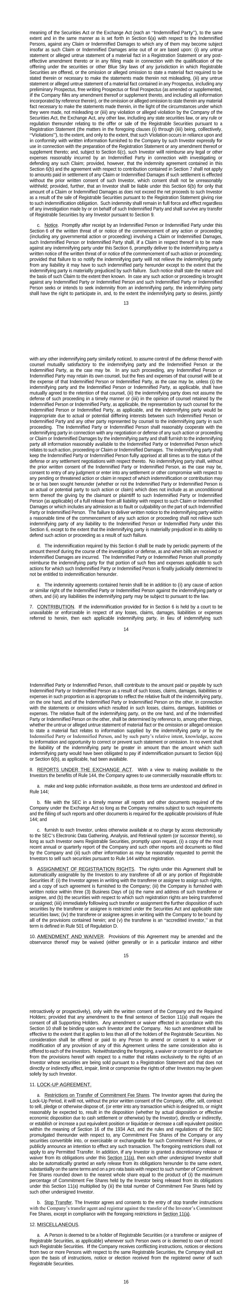 13 meaning of the Securities Act or the Exchange Act (each an “Indemnified Party”), to the same extent and in the same manner as is set forth in Section 6(a) with respect to the Indemnified Persons, against any Claim or Indemnified Damages to which any of them may become subject insofar as such Claim or Indemnified Damages arise out of or are based upon: (i) any untrue statement or alleged untrue statement of a material fact in a Registration Statement or any post- effective amendment thereto or in any filing made in connection with the qualification of the offering under the securities or other Blue Sky laws of any jurisdiction in which Registrable Securities are offered, or the omission or alleged omission to state a material fact required to be stated therein or necessary to make the statements made therein not misleading, (ii) any untrue statement or alleged untrue statement of a material fact contained in any Prospectus, including any preliminary Prospectus, free writing Prospectus or final Prospectus (as amended or supplemented, if the Company files any amendment thereof or supplement thereto, and including all information incorporated by reference therein), or the omission or alleged omission to state therein any material fact necessary to make the statements made therein, in the light of the circumstances under which they were made, not misleading or (iii) any violation or alleged violation by the Company of the Securities Act, the Exchange Act, any other law, including any state securities law, or any rule or regulation thereunder relating to the offer or sale of the Registrable Securities pursuant to a Registration Statement (the matters in the foregoing clauses (i) through (iii) being, collectively, “Violations”), to the extent, and only to the extent, that such Violation occurs in reliance upon and in conformity with written information furnished to the Company by such Investor expressly for use in connection with the preparation of the Registration Statement or any amendment thereof or supplement thereto; and, subject to Section 6(c), such Investor will reimburse any legal or other expenses reasonably incurred by an Indemnified Party in connection with investigating or defending any such Claim; provided, however, that the indemnity agreement contained in this Section 6(b) and the agreement with respect to contribution contained in Section 7 shall not apply to amounts paid in settlement of any Claim or Indemnified Damages if such settlement is effected without the prior written consent of such Investor, which consent shall not be unreasonably withheld; provided, further, that an Investor shall be liable under this Section 6(b) for only that amount of a Claim or Indemnified Damages as does not exceed the net proceeds to such Investor as a result of the sale of Registrable Securities pursuant to the Registration Statement giving rise to such indemnification obligation. Such indemnity shall remain in full force and effect regardless of any investigation made by or on behalf of such Indemnified Party and shall survive any transfer of Registrable Securities by any Investor pursuant to Section 9. c. Notice. Promptly after receipt by an Indemnified Person or Indemnified Party under this Section 6 of the written threat of or notice of the commencement of any action or proceeding (including any governmental action or proceeding) involving a Claim or Indemnified Damages, such Indemnified Person or Indemnified Party shall, if a Claim in respect thereof is to be made against any indemnifying party under this Section 6, promptly deliver to the indemnifying party a written notice of the written threat of or notice of the commencement of such action or proceeding; provided that failure to so notify the indemnifying party will not relieve the indemnifying party from any liability it may have to such indemnified party hereunder except to the extent that the indemnifying party is materially prejudiced by such failure. Such notice shall state the nature and the basis of such Claim to the extent then known. In case any such action or proceeding is brought against any Indemnified Party or Indemnified Person and such Indemnified Party or Indemnified Person seeks or intends to seek indemnity from an indemnifying party, the indemnifying party shall have the right to participate in, and, to the extent the indemnifying party so desires, jointly 14 with any other indemnifying party similarly noticed, to assume control of the defense thereof with counsel mutually satisfactory to the indemnifying party and the Indemnified Person or the Indemnified Party, as the case may be. In any such proceeding, any Indemnified Person or Indemnified Party may retain its own counsel, but the fees and expenses of that counsel will be at the expense of that Indemnified Person or Indemnified Party, as the case may be, unless (i) the indemnifying party and the Indemnified Person or Indemnified Party, as applicable, shall have mutually agreed to the retention of that counsel, (ii) the indemnifying party does not assume the defense of such proceeding in a timely manner or (iii) in the opinion of counsel retained by the Indemnified Person or Indemnified Party, as applicable, the representation by such counsel for the Indemnified Person or Indemnified Party, as applicable, and the indemnifying party would be inappropriate due to actual or potential differing interests between such Indemnified Person or Indemnified Party and any other party represented by counsel to the indemnifying party in such proceeding. The Indemnified Party or Indemnified Person shall reasonably cooperate with the indemnifying party in connection with any negotiation or defense of any such action or proceeding or Claim or Indemnified Damages by the indemnifying party and shall furnish to the indemnifying party all information reasonably available to the Indemnified Party or Indemnified Person which relates to such action, proceeding or Claim or Ind